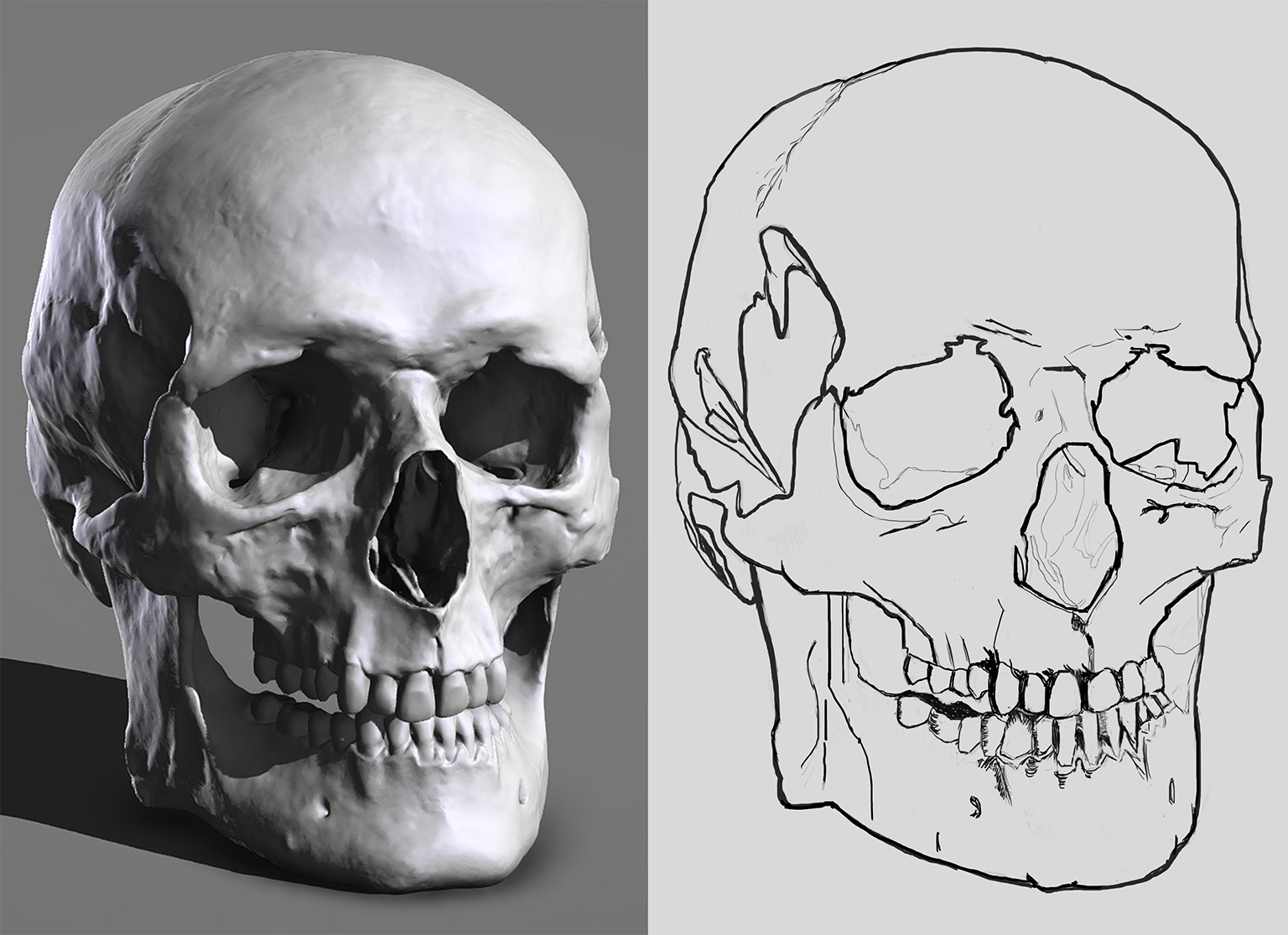En corrigeant la structure de la dentition, j'ai finis par refaire le crâne au complet pour les proportions et les angles, etc... J'ai passé une 8 heures à corrigé ma dernière version. Je pense que cela en valait la peine. Du coup, mes lines sont plus net et j'ai pensé à faire la transition d'épaisseur pour qu'elle ne change pas drastiquement. j'ai essayé le plus possible de respecter l'épaisseur par rapport au plan le plus proche et éloigné. Je n'ai pas fait mes hachures je voulais valider le crâne sans avant.