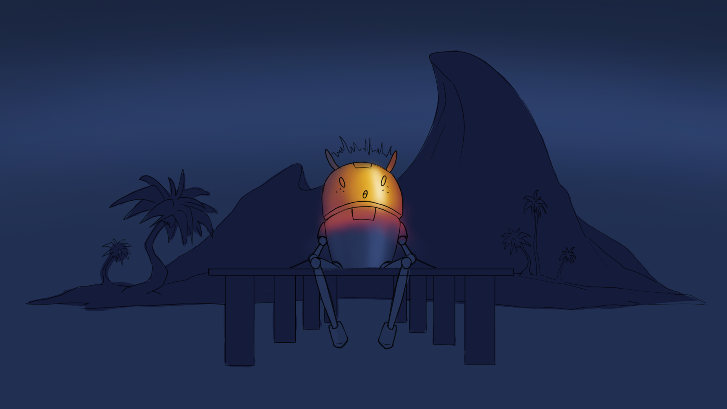 7. Hello ! Nice tout ça ! Les formes en volume marchent assez bien et pas grand chose à en redire ! C'est top ! Pour le robot, je pense que tu mettre le dessin à la ligne tout en noir en le fonçant ou alors mettre son calque en mode "Produit" histoire qu'on le voit bien et qu'il se mélange moins avec le reste de ta peinture ! Je pense que la couleur de l'eau est un peu trop grise et que globalement le décor manque de saturation, donc que le bleu soit un peu plus intense dans sa globalité ! Et hésite pas à bien remplir les formes des éléments de l'île, là on voit un peu le fond par transparence je crois : Plus les contours sont propres et les formes bien remplies, plus c'est facile de repeindre par dessus 🙂 Pour le dessin perso : Il est cool ! Y a plusieurs angles qu'on peut prendre pour l'améliorer : Soit un recadrage : Je pense qu'au vu de la position que t'as donnée au jambes, ça pourrait être sympa de voir tout le corps pour suggérer un tout peu le décor et sa manière d'être assise ! Soit pousser la narration : En gros là ton dessin ce qui est dommage c'est que j'ai pas de contexte, je sais pas qui est le perso, ce que tu veux qu'on se dise ou qu'on ressente en voyant ton image. Par exemple se dire "Je veux que la perso soit badass, ait l'air confiante et nous regarde de haut" ou au au contraire "elle sort d'une bataille, elle est blessée et fatiguée, et elle regarde la caméra presque avec tristesse" ,etc.... Ca peut paraître anodin, mais ce genre de petit détails peuvent améliorer tout le dessin et lui donner plus d'identité parce que tu vas te dire "Okay je veux qu'elle soit badass. Comment je fais ressentir ça ? Et ensuite je veux qu'elle nous regarde avec dédain, à quoi ça ressemble une expression de dédain ?" ,etc... Là je trouve que la perso est encore un poil trop neutre et qu'en poussant la narration ou donnera une identité plus affirmée à l'image 🙂