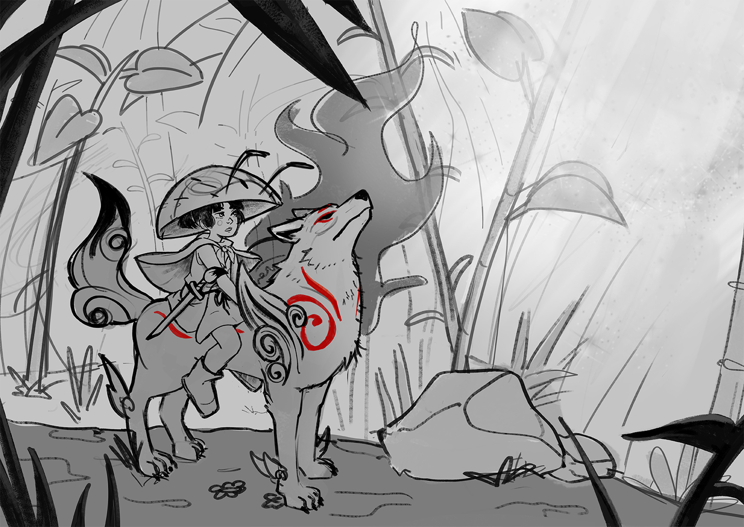 Merci beaucoup 😍 En effet, tu as pointé des bons problèmes auxquels je n'avais pas pensé ! J'ai réajusté la cape afin qu'elle ait l'air d'être mieux la continuité de l'autre côté, et j'ai beaucoup descendu l'épée pour rendre cet endroit plus lisible. J'ai essayé de la passer sous le bras, mais on ne comprenait plus l'objet du tout (et c'est un élément important...) donc je me suis dit qu'en le mettant à un endroit légèrement moins problématique, ça passerait inaperçu haha J'ai aussi amélioré un peu l'avant-plan pour qu'il se fonde mieux à la scène, j'ai rajouté l'arme de feu du loup à l'arrière (qui met mieux en valeur sa tête je trouve !) dont j'ai encore corrigé l'anatomie, je crois qu'on arrive à quelque chose de bien là 😊