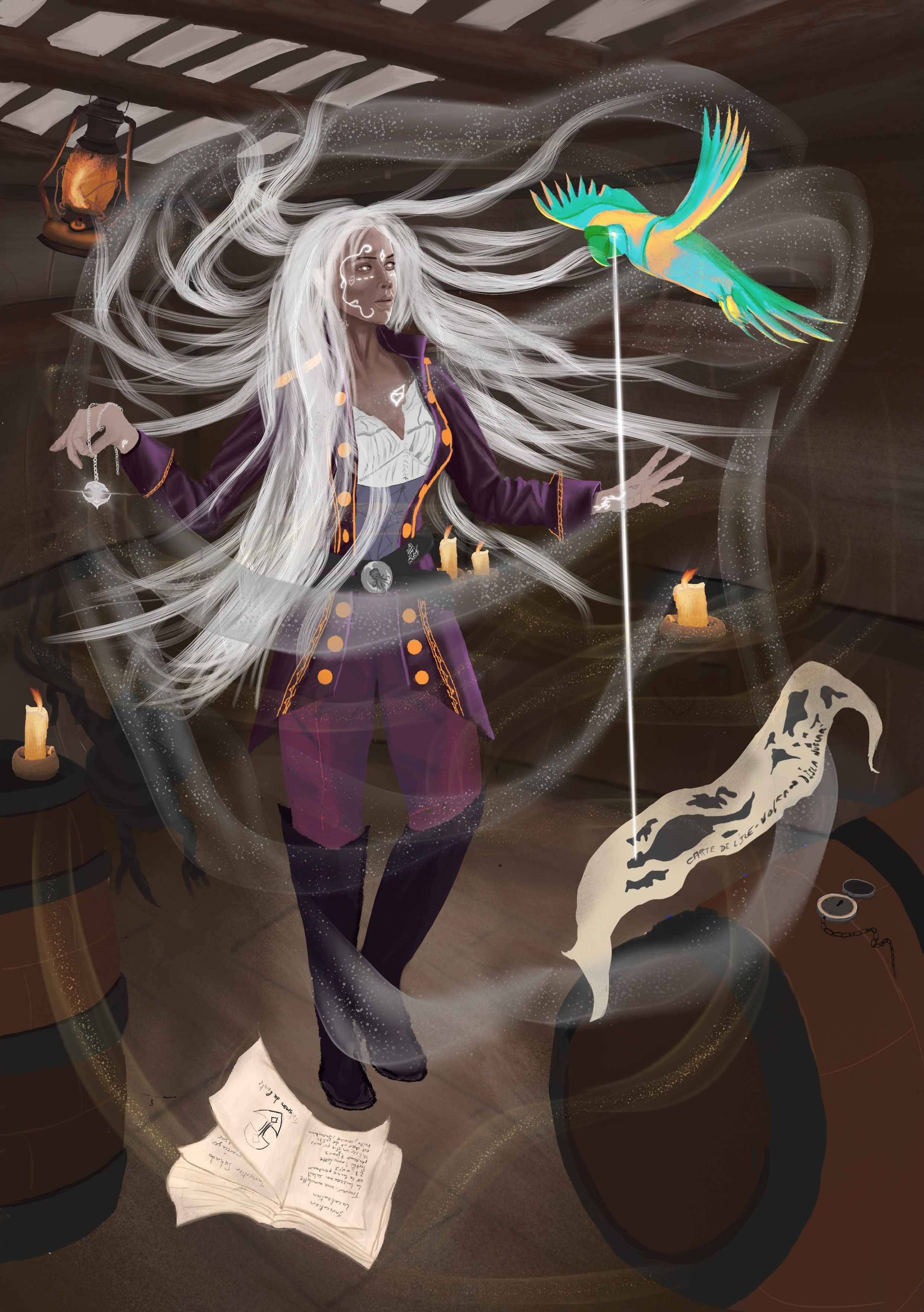 Bonjour, voici l image avec les corrections. -j ai modifié les jambes, la main droite et la carte. -j ai fait un essai de couleur des boutons de la veste, l idée était de faire une pointe de orange pour aller avec les bougies mais je pense les faire plutôt blanc comme dans la précédente version. - etant donnée qu elle est en train d invoquer le perroquet, je me suis dit que Sakado pourrait pointer son nez derrière elle sans qu elle ne s en rende compte, première fois où il apparaît. L idée ici c est qu il est en cours de développement donc faire une main qui se forme et le sac aussi. J aimerais le faire à l aspect gluant mais je ne sais pas encore comment faire, je vais voir.