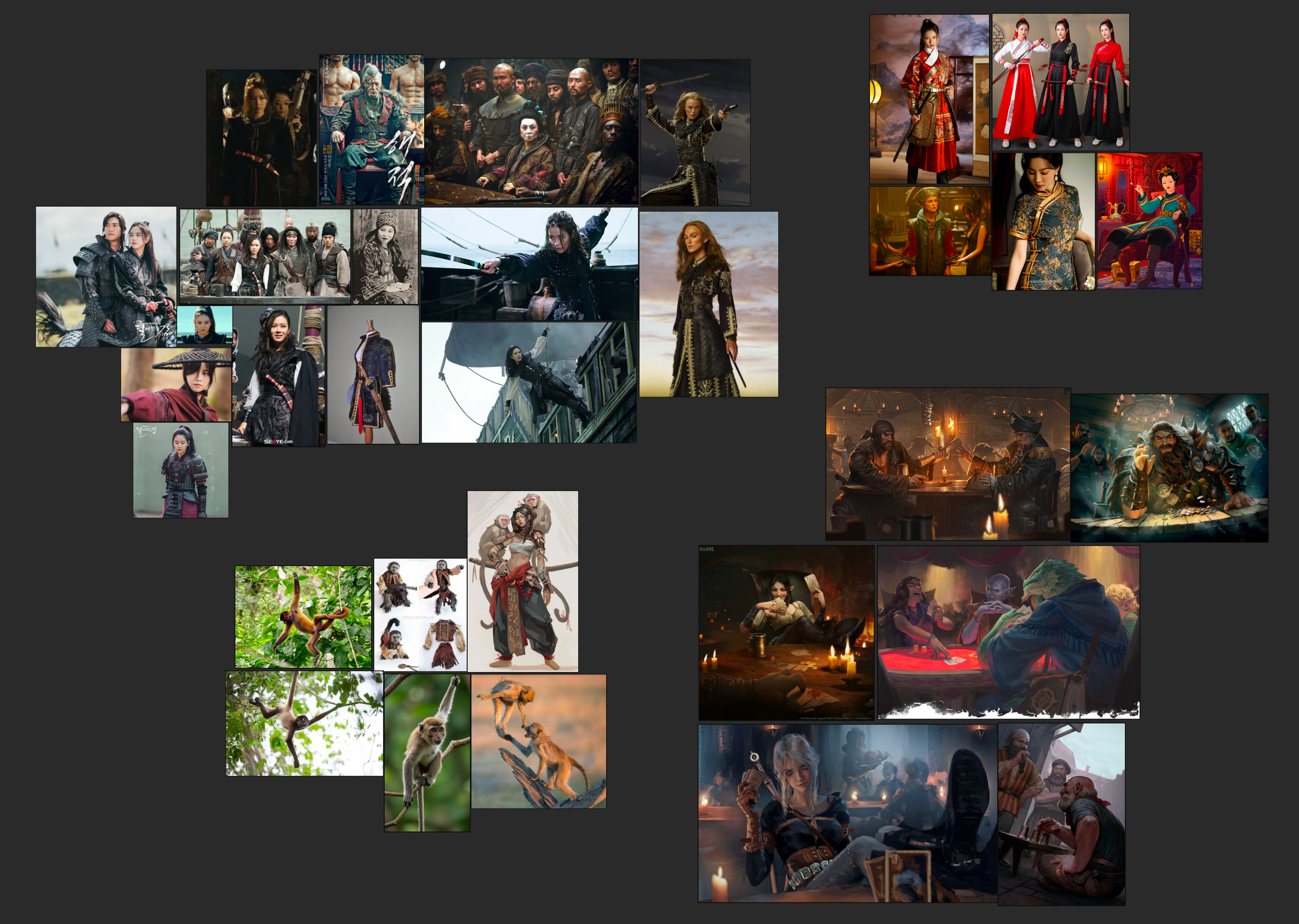 Bonjour, voici mes recherches et premiers tests de compo pour la lame bleue. La deuxième compo me parait plus immersive (même si crado parce que j'ai copié/collé de la première) mais j'aimerais retravailler la position de la lame bleue pour qu'elle paraisse plus relax. J'aimerais également donner un petit signe distinctif au singe pour qu'on reconnaisse qu'il est de mèche avec elle.