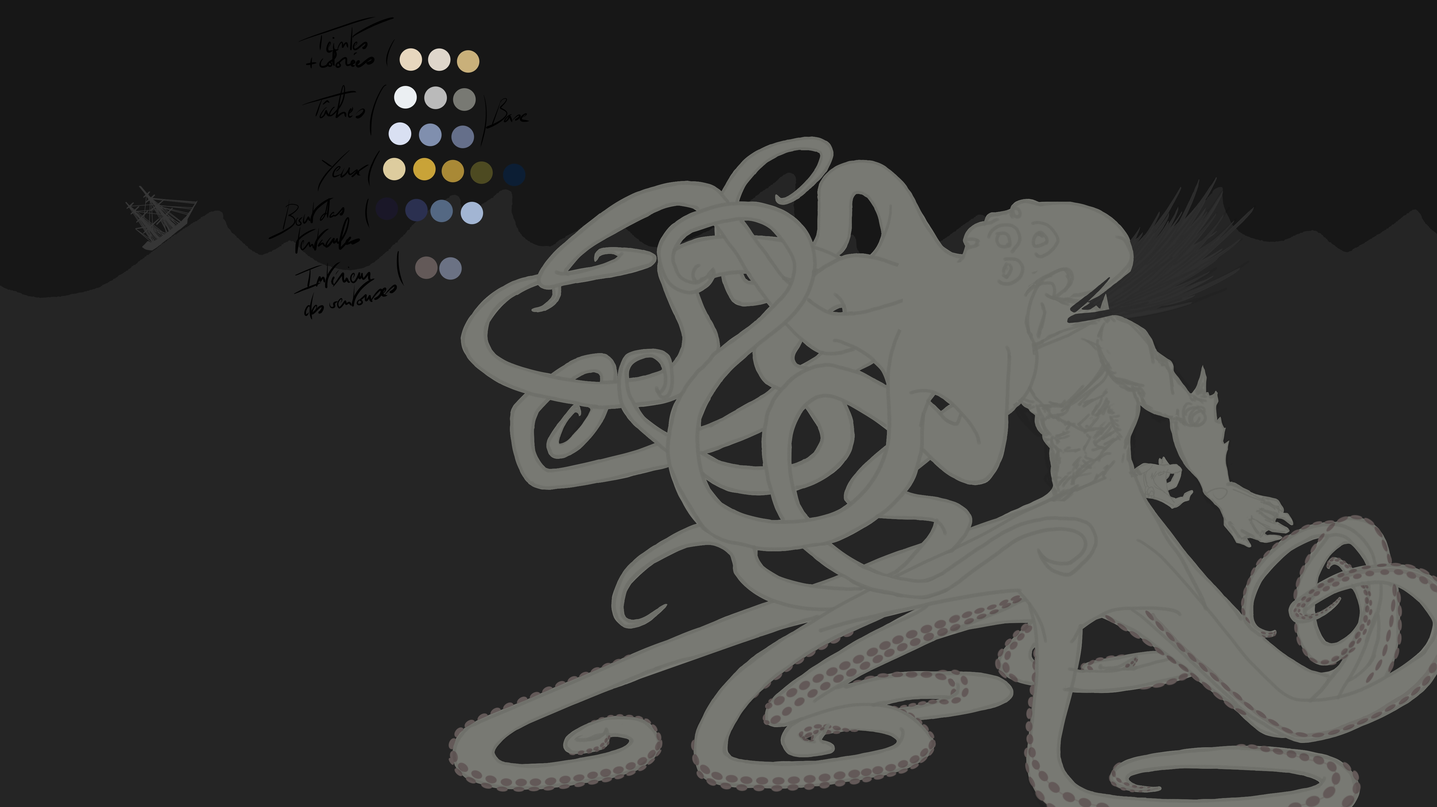 Merci pour ton retour @Wil dessine, la compo c'est un des nombreux trucs que je ne maîtrise pas du tout ! 😄 Si je comprends bien, ta proposition implique que je change complètement l'angle de vue de l'image, pour voir le kraken de face depuis un bateau pirate ? Si c'est bien ça, j'y ai pensé, mais je voulais : 1) Que la partie visible du kraken ne soit que la tête, pour coller au lore traditionnel (kraken = poulpe géant, c'est tout 😛) 2) L'opportunité de voir le Kraken en entier, vue que je m'écarte pas mal du tradi ! Si j'ai mal compris, n'hésite pas à me réexpliquer ton idée ! 🙂 Edit: Mais en fait, suite à ta proposition je me dis que je pourrais tout à fait lui mettre des bateaux dans les têtacules et avoir du coup le Kraken au centre de l'image, comme ça paf, au cœur de l'action ? Et sur ce, dernière update : j'ai fini les aplats des ventouses des jambacules 🥹🥳 Plus qu'à faire la même pour les têtacules...🫠