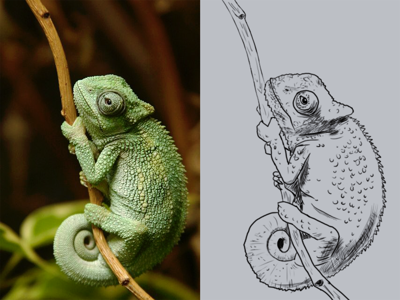 J'en ai commencer 3 autres qui me donne beaucoup plus de mal, le casque de scaphandre, un environnement et un personnage 😬 Sinon voici ma version de ce caméléon
