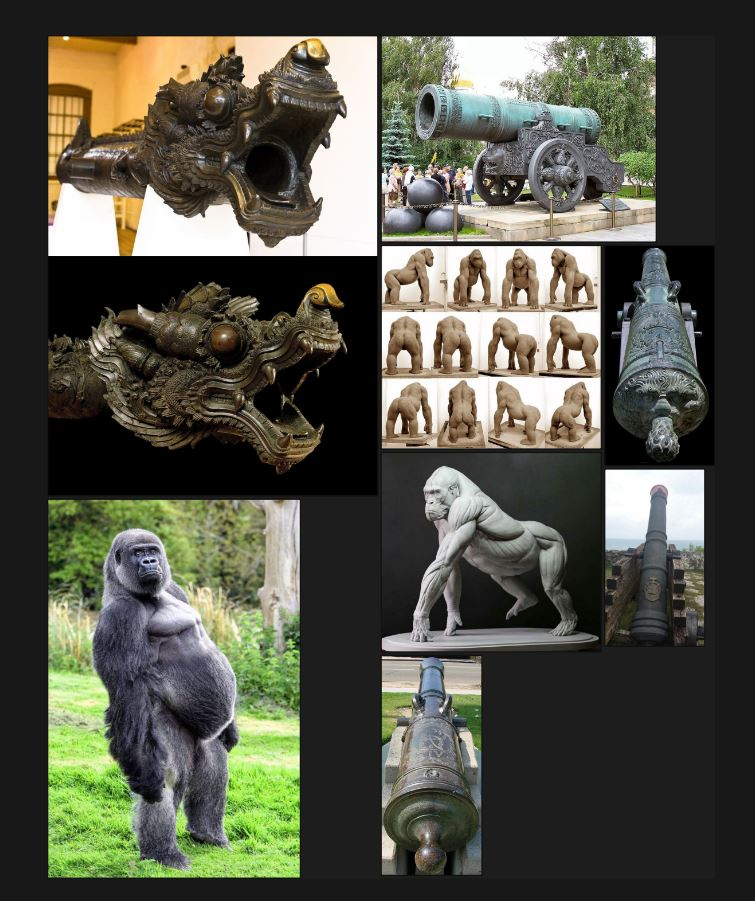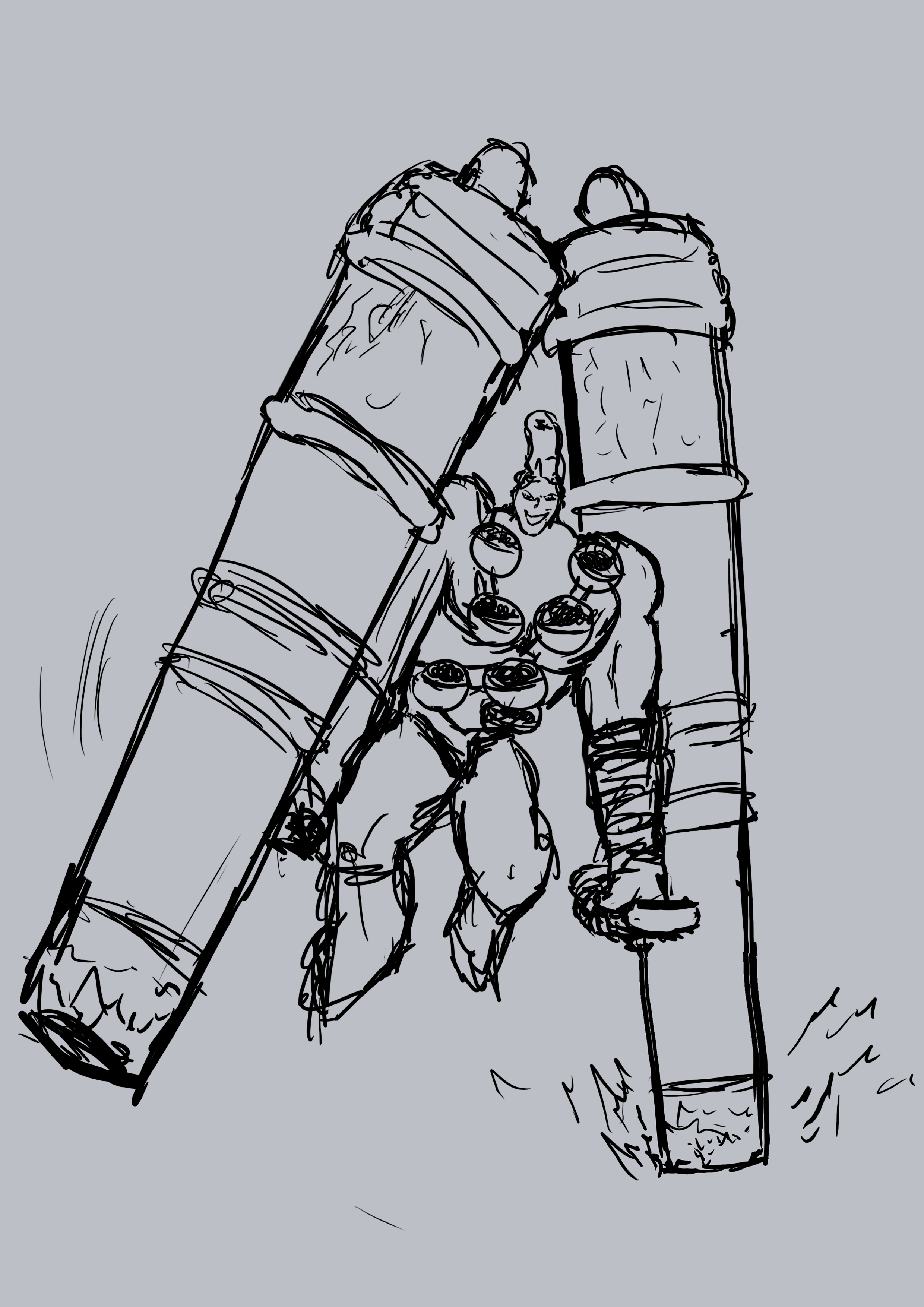 J'avance tout doucement, j'ai décider lui donner une morphologie de gorille vu que ses canons sont constamment accrocher à ses bras. Je ne sait toujours pas comment le mettre en scène dans une illustration, peut-être face à nous s'éloignant tranquillement d'un village portuaire qu'il vient de mettre en ruine