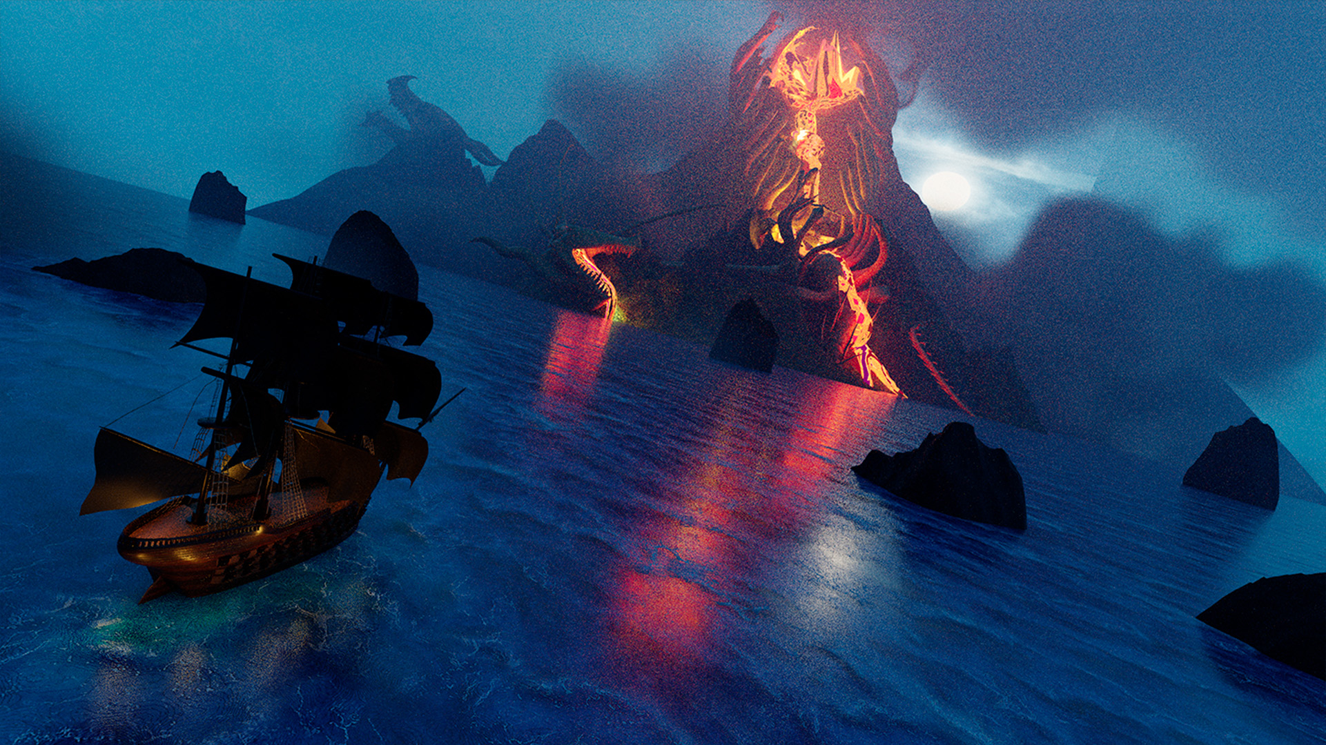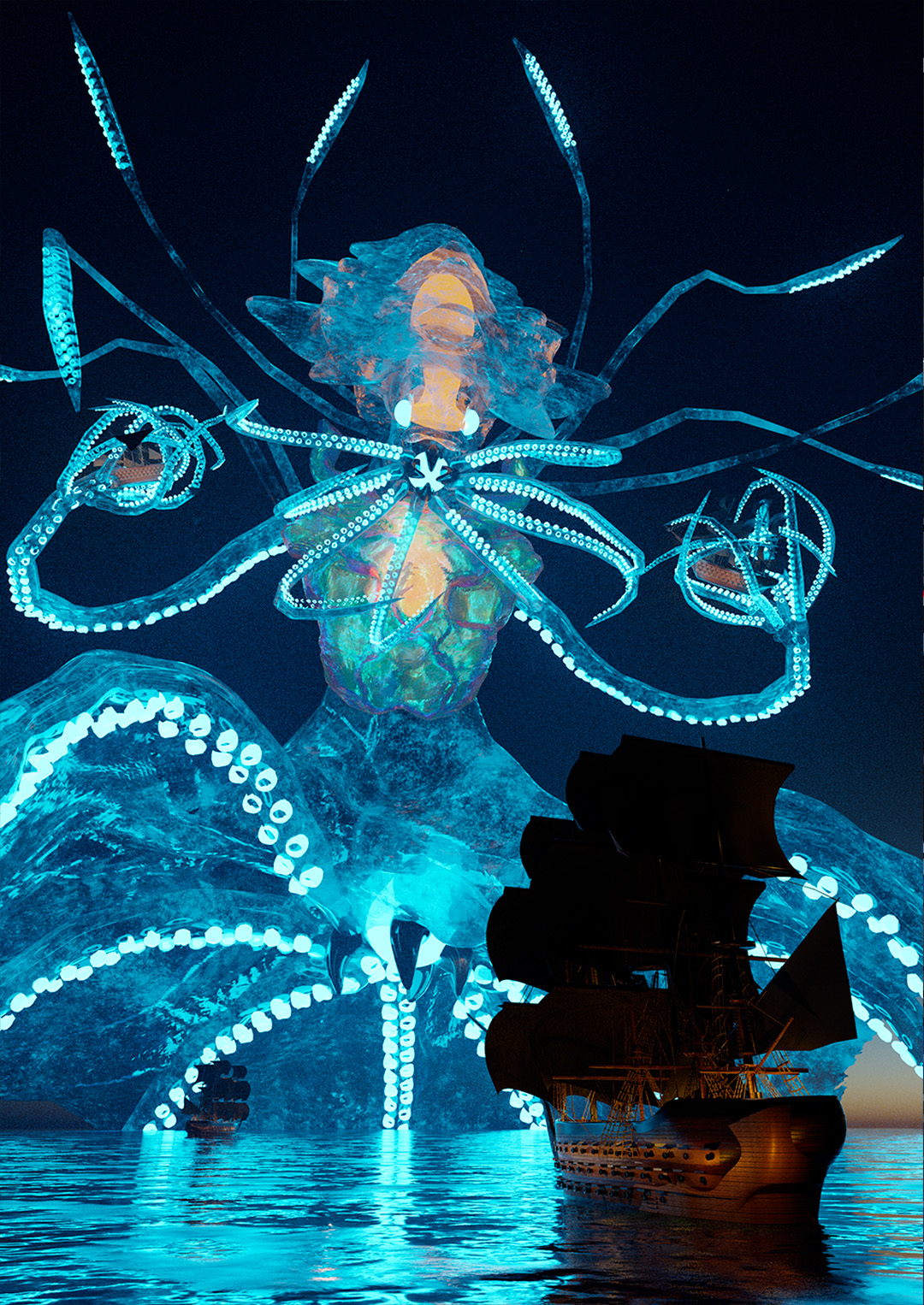 Hello, j'aime beaucoup ta compo avec le Kraken, ya un style cthulu je trouve, ça change du kraken classique. pour la deuxième image, la compo marche bien, mais je trouve ça dommage qu'on ne voit pas l'île de plus près, sur ton concept l'île était plus mise en valeur je trouve. En tout cas je pense que ça va être cool ! Bon courage ! -