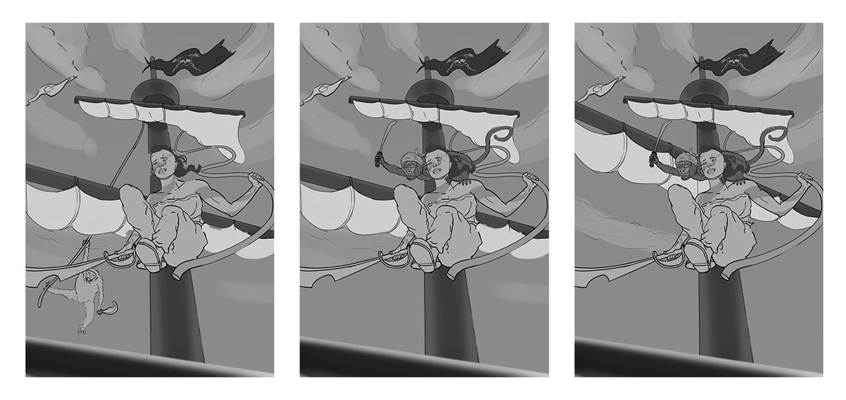 j'ai fait plusieurs tests de compos, surtout pour le singe, parce que le perso me plait pas mal pour le moment, j'ai essayé un nouveau singe que je trouve sympa, mais du coup j'ai le sentiment que ça charge. trop le le centre de l'image... Vous en pensez quoi ? -
