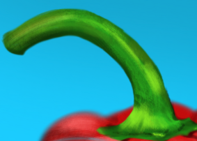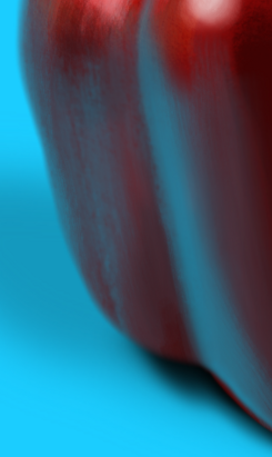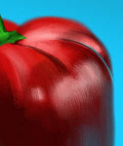 Pour le poivron : -Dans l'ensemble sa forme est bcp trop alongée et les couleurs bcp trop saturées pour le moment , les rouges trop froid et lumineux -la couleur de la tige est bcp trop saturée pour le moment également et tu peux venir la flouter sur l'extrémite - -tes rouges sont trop froid et trop contrasté pour le moment , ici ton reflet est trop lumineux et tu a des ombres sur les rebord trop marquées et sombres - - tes refles sont un peu trop dans une teinte bleu et devrait etre plus proche d'un violet ici - tu ne devrais pas avoir une délimitation aussi marqué en bleu ici Pour la tasse : dans l'ensemble il y'a surtout des problème de proportions forme et de couleurs : -le haut de la cuillère devrait etre bcp plus sombre et saturé en orange avec une rim light chaude tres franche sur les bords - - il y'a un vrai probleme de forme sur la coupelle , elle est un peu difforme et manque de largeur sur la droite , tu peux aussi venir rajouter bcp plus de teintes chaude rouge orangé en degradé - -ton motif est trp chaud pour le moment , tu peux venir refroidir sa teinte et rendre ta tasse moins lumineuse également surtout sur la partie droite -cette partie est trop sombre et manque de lumière chaude - -fait attention a ton fond , il est trop saturé et contrasté par endroit - - la boucle ici de la tasse manque de saturation dans le jaune à l"interieur et de contraste en general dans sa partie ombrée -