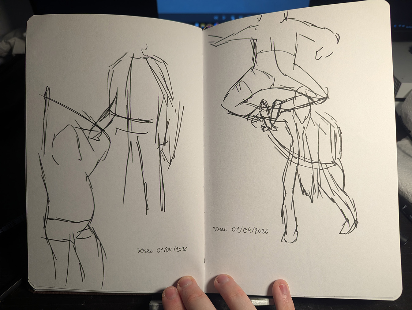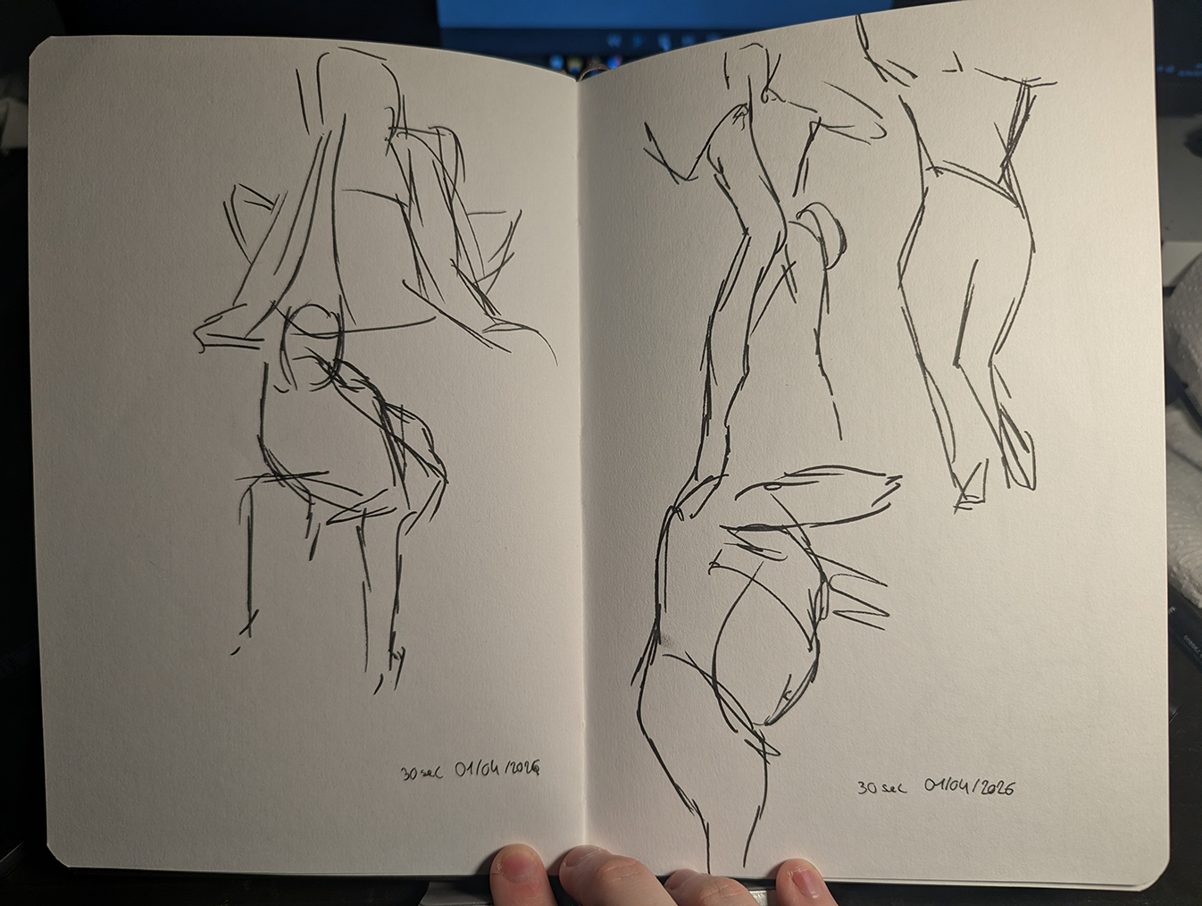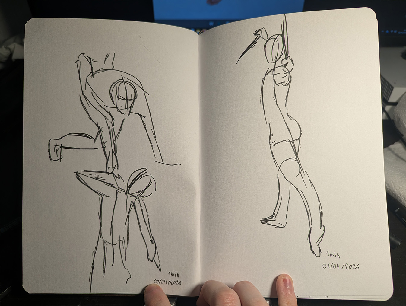 Salut ! Bon petite session de gesture, j'avais jamais fait avant j'ai fait avec le site line of action, 20 min 5 chacune, et bah je m'attendais pas à ce que ce soit aussi dur 😅 et mine de rien le temps passe suuuuper vite ! -