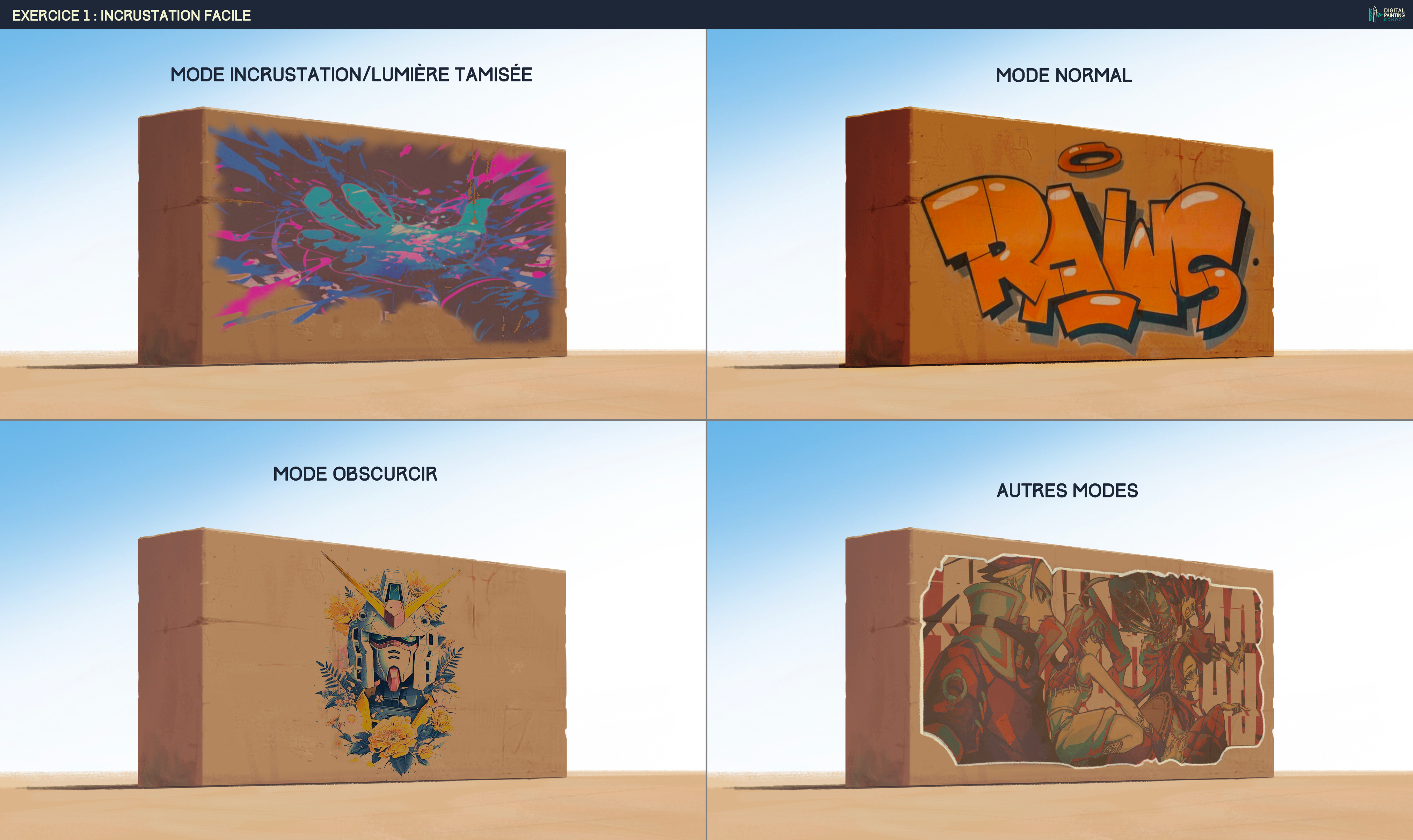 Bonjour à tous, Pour cet exercice, j'ai eu un peu d'inspiration et j'ai utilisé d'autres illustrations. Je pense que ce serait difficile à comparer... Pour être honnête, je suis content des résultats avec le mode "Normal" et le mode "Obscurcir", mais pas avec les deux autres. J'ai donc deux questions : est-ce que n'importe quelle photo, quelles que soient ses couleurs, peut s'adapter et donner un bon résultat ? Parce qu'avec le mode "Obscurcir"... c'était un pur hasard que la photo utilisée ait un fond blanc, ce qui a aidé à bien l'intégrer à l'arrière-plan. Mais pour les deux autres (le mode "Incrustation" et autres), les images utilisées avaient principalement un fond sombre, ce qui, à mon avis, rend difficile leur incrustation sur l'image du mur. Avez-vous des commentaires ou des avis là-dessus ? Merci beaucoup pour votre aide et vos retours. Salutations