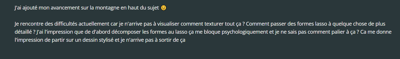 Et je fais également mon bilan : Pour ma part en 2025 : ❌👉 Objectif 1 : Réaliser et publier encore plus de créations qu'en 2024 ✅ 👉 Objectif 2 : Un objectif secret que je me fixe pour mes digital paintings Je n'en parle pas encore, on verra si je l'aurais atteint l'an prochain 😉 ✅👉 Objectif 3 : Mettre à jour les cours en début d'année ❌👉 Objectif 4 : Préparer et commencer un nouveau gros cours en 2025 pour une sortie en fin d'année 2025 ou début 2026 ✅ 👉 Objectif 5 : Réaliser plus de vidéos Youtube qu'en 2024 ----- ✅👉 Objectif 6 perso : Conserver autant de temps libre qu'en 2024 pour voyager, faire du sport, jouer, lire, etc. Le bon équilibre a été trouvé, maintenant il faut le conserver ✅👉 Objectif 7 perso : voyager plus qu'en 2024 et gravir au moins 1 sommet ✅ 👉 Objectif 8 perso : améliorer mon cardio de larve 😄 Un bilan mitigé côté digital painting pour moi avec moins de temps que ce que j'aurais voulu à allouer à cette passion... même si j'ai plein de digital paintings presque terminés qui sortiront bientôt 😁 Et pas de nouveau cours oublié en 2025 MAIS à la place on a sorti Digital Painting Masters, le Discord de mentoring avancé donc... l'un dans l'autre ça compense. Et côté perso par contre j'ai réussi à me tenir sur tout et ça j'en suis très content. Et je vous créé dans la foulée le sujet pour 2026 😄 -
