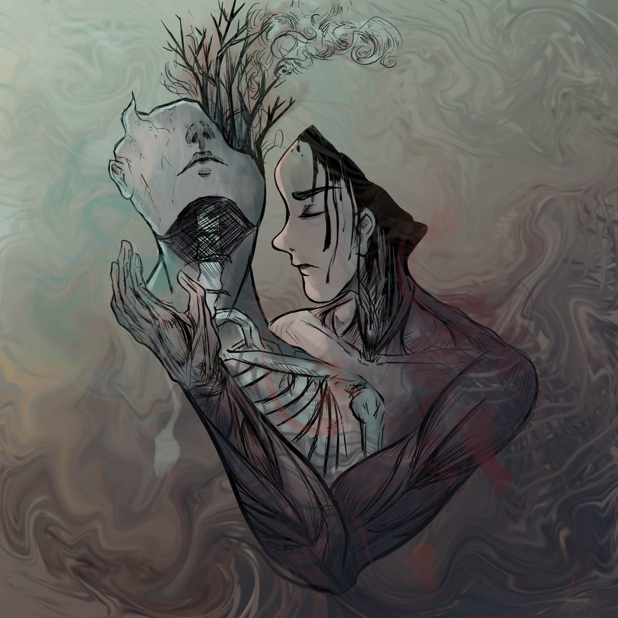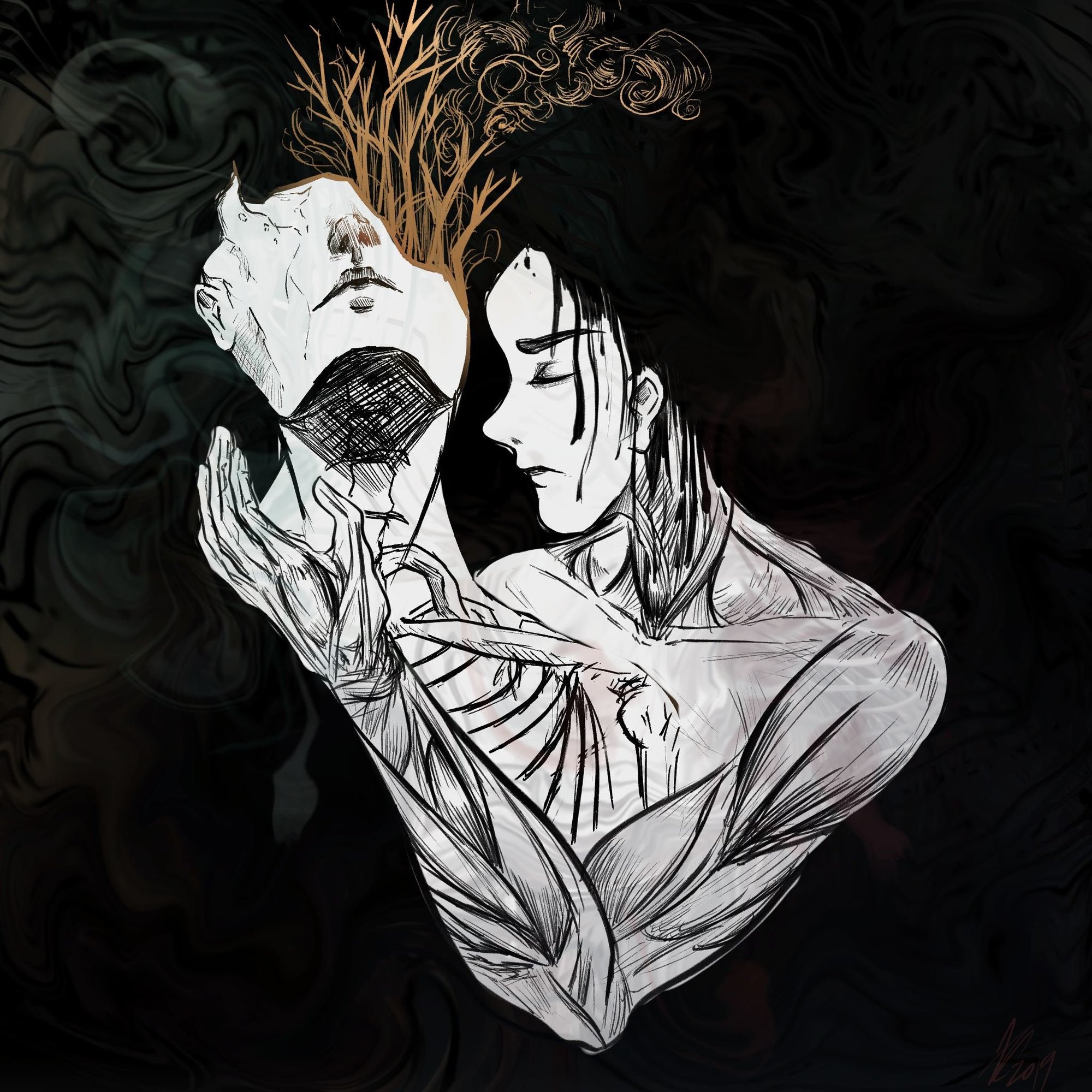 Bonsoir bonsoir !! Ravie de vous voir aussi motivé pour l'inktober et avec des idées aussi riches! 😃 @mumei j'aime beaucoup le point de vue et le mouvement qui en ressort! Peut-être que j'aurai rétréci la paume de la main vers l'arriere pour continuer cet effet de perspectives travaillées pour les doigts et le bras. (attention la couronne va tomber aussi ^^) @tequila j'adore le choix des couleurs et leurs travailles ! Mais désolé je ne connais pas encore la technique du chaos. @arno c'est hyper propre o.o je suis fan ! Surtout que c'est au stylos direct ❤️ @lum_illu super posé ce dessin 😃 il émane un grand calme! J'aurai peut-être essayé de donner une cage thoracique un chouille plus costo et un courbe au dos pour éviter que ce soit trop droit . Voici mon dessin, j'ai eu beaucoup de mal a trouvé l'idée depuis la parution de la liste officiel ^^' Normalement je dessine directement au stylo pour l'inktober, à main levé. Mais là en passant par une première phase au crayon, j'ai trop peur de continuer, et apposer l'encre directement dessus! Je pense que plus tard je le ferais via Photoshop, car je suis assez fière de moi. Quelque chose me dérange au niveau du visage mais je n'arrive pas vraiment à le déterminer... Et je pense encore avoir fait des erreurs en perspectives, c'est ma bête noire, et je suis incapable de placer les repères sur ce type de prise de vue...5 points