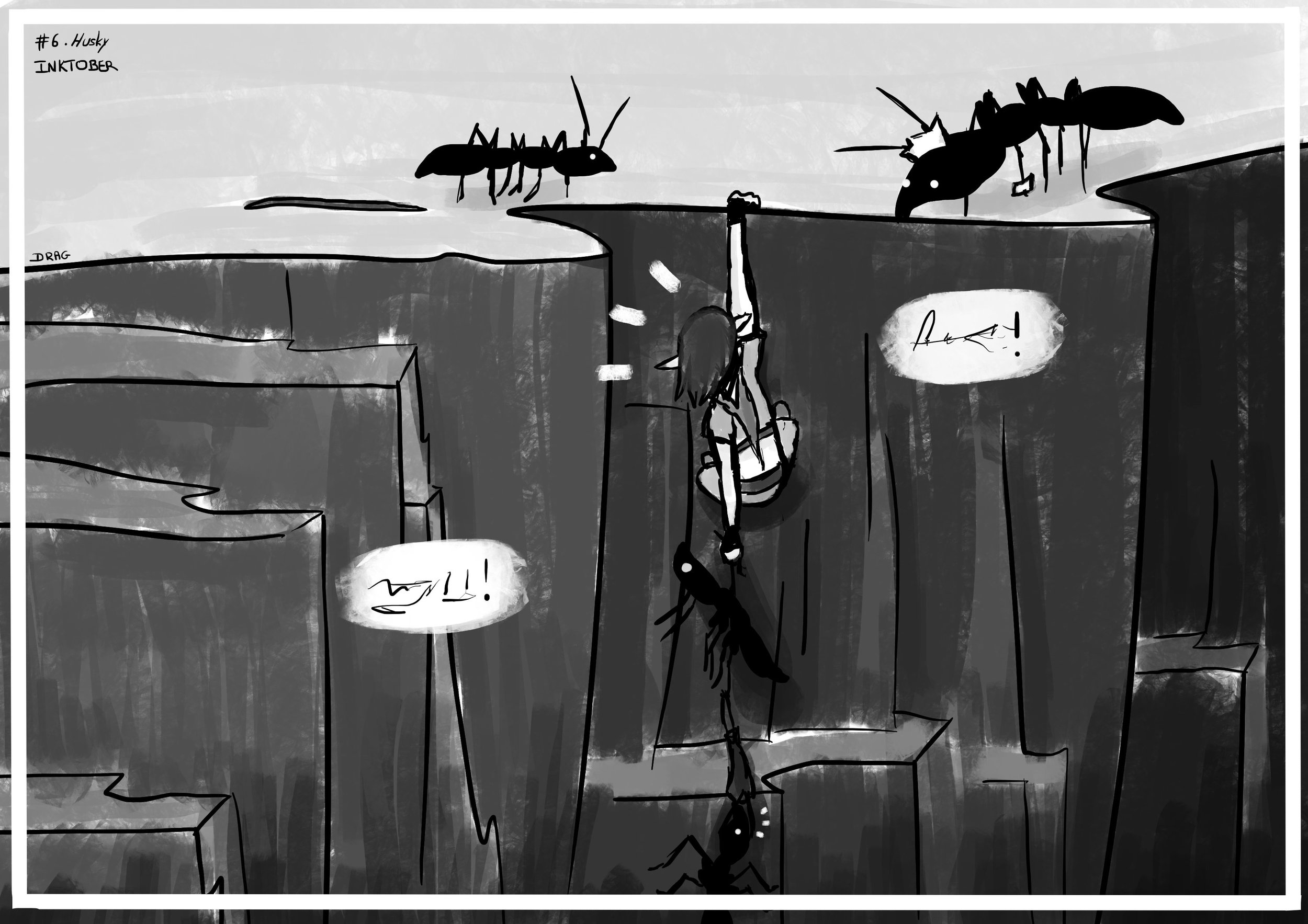 Bonsoir! J'ai réussis à rattraper mon retard donc me revoici 🙂 @Laure Favreau ton husky est vraiment à croquer! @lbochoco porter le monde sur ses épaules, ça correspond super bien au thème bien joué! @MakiOni Je me régale chaque jour à regarder les illustrations de ton jeu de carte! Je n'ai rien à dire, elles sont superbes! Bien joué, j'ai hâte de voir ce que donnera le jeu entier 😉 Pour ma part, j'ai associé le mot "husky" à la traduction "costaud". Voici donc la suite de la petite épopée de mon elfe protectrice des insectes, accompagnée de ses fourmis...qui se sont retrouvées dans une bien mauvaise position. Je suis agréablement surprise par le rendu finale, pour un thème qui ne m'inspirait pas beaucoup, voir pas du tout. Je commende déjà à voir des progrès par-rapport aux premiers dessins que j'ai posté, j'en suis toute contente 🙂 Bonne soirée !1 point