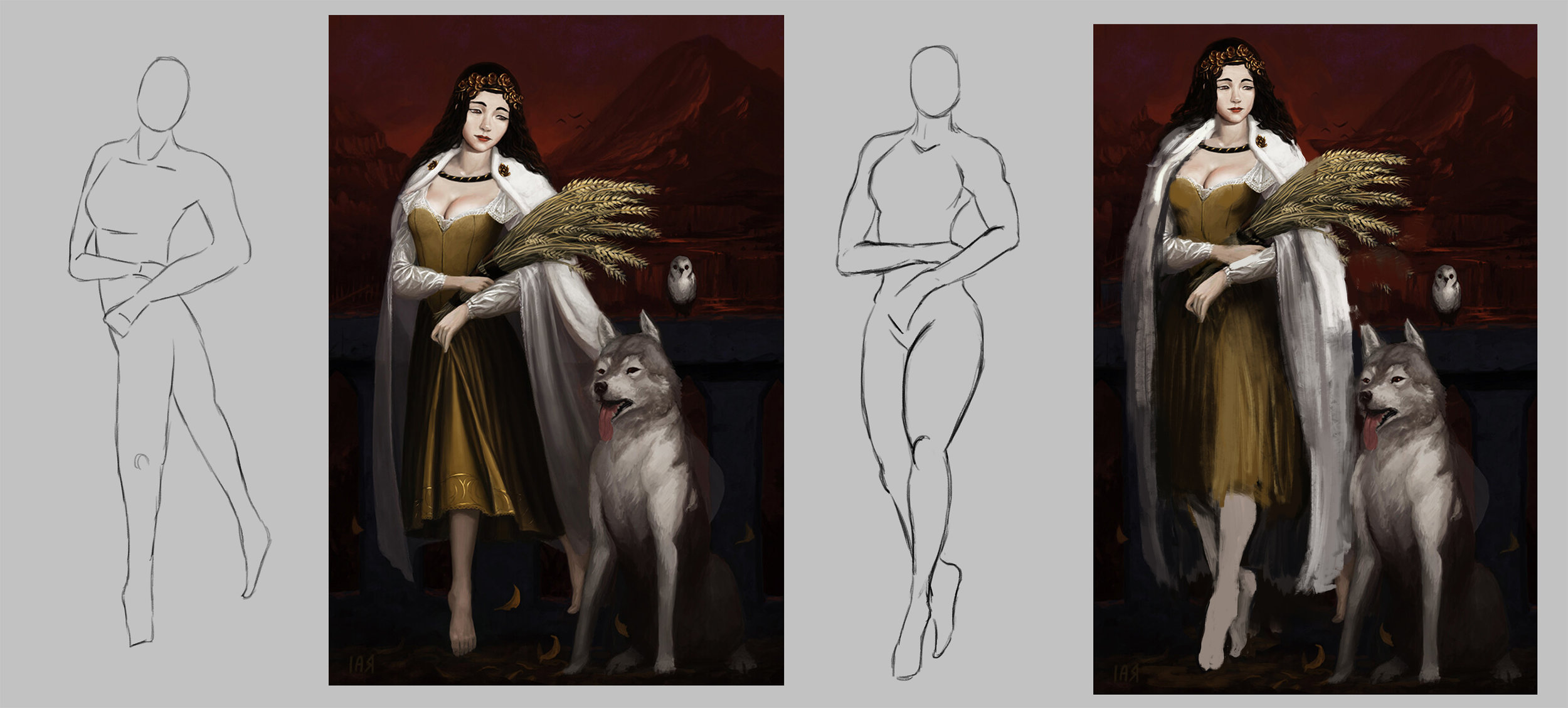 Salut @Rai Wald 🙂 Voilà je me suis permis de toucher à ta dernière image, seulement dans un but explicatif et uniquement par rapport à l'anatomie. Je suis pas encore excellent en anatomie j'ai fait se que j'ai pu. Je me suis basé sur la positon des pieds pour déterminer la posture ce qui fait perdre beaucoup au dynamisme original, c'est pas parfait, j'ai fait ça en 2-2, mais ça montre de façon efficace les problèmes. On voit directement les erreurs de proportions (petites liste rapide) Haut du corps - Épaule et clavicule droit trop petit comparé au côté gauche. - Bras droit trop petit du au problème de l'épaule et position étrange. - Main trop petite. - Épaule gauche trop grande. - Avant bras gauche trop grand et gonflé. Taille le corps semble de 3/4 et en même temps de face. J'ai l'impression que tu as pas su choisir entre les deux. Jambes Ta jambe de devant qui est pile de face alors que sont corps et de 3/4 c'est surement le problème, juste tournée la jambe/pied réglerai une grande partie de l'anatomie sans perdre le mouvement vraiment classe de ton personnage. Voilà sinon rapidement, j'ai cru voir un problème anatomique sur la patte du chien. J'adore ton monochrome rouge pour le fond mais je pense que cette lumière rouge aurait plus d'impact sur tes personnages, tout beigne littéralement dans une ambiance rouge. Difficile à dire, surtout qu'il semble y avoir une source de lumière de face. En tous cas très bon travail 🙂.1 point