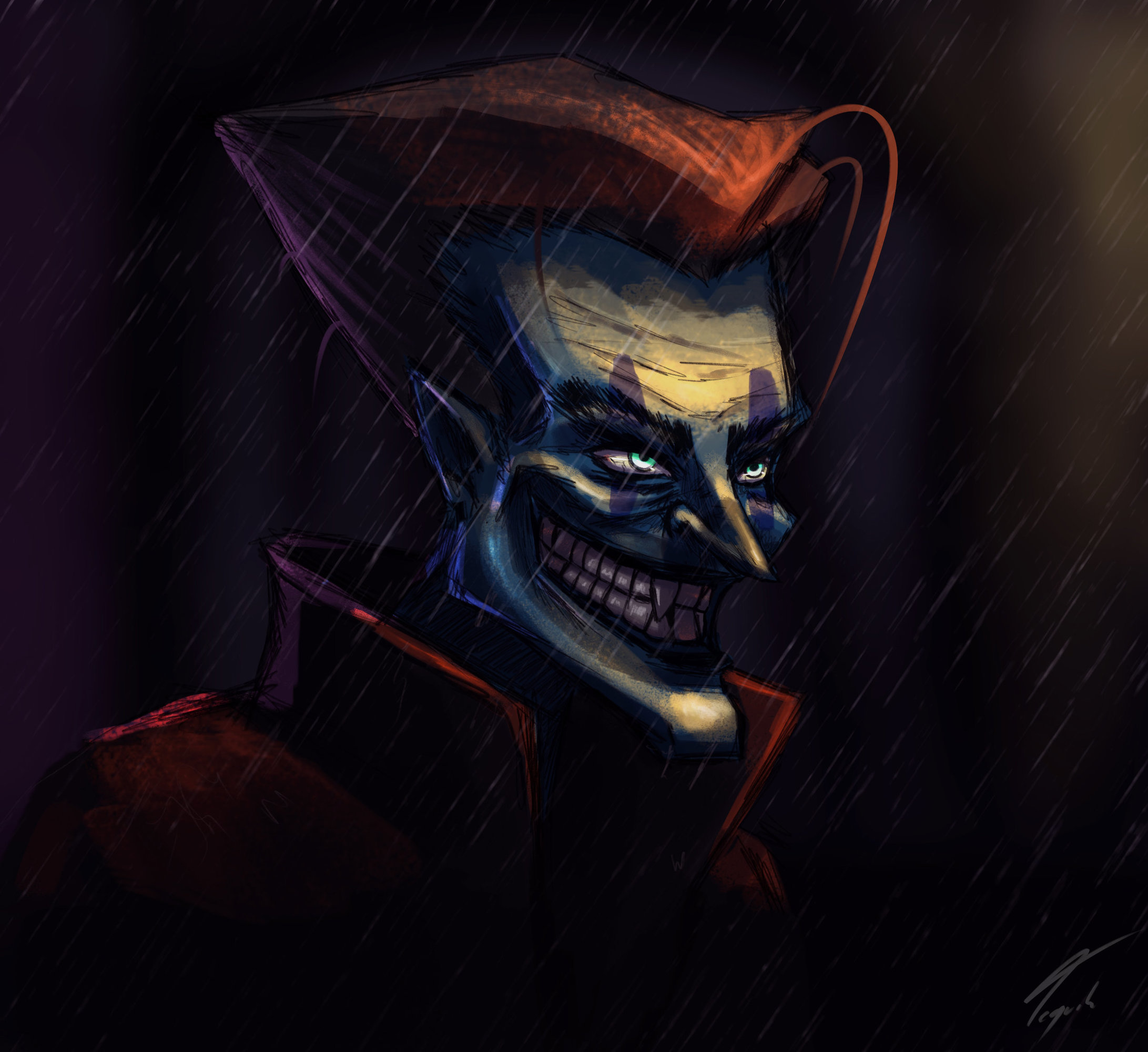@Tequila Une interprétation très intéressante! Tu as bien retranscrit l'expression faciale du Joker! @Terra Très bon travail au niveau de l'ombrage, j'ai presque cru que c'était un rendu réalisé en 3D! L'effet de mouvement est très bien réalisé! @lisaru C'est toujours intéressant de voir comment tu développes ton univers! Bravo!5 points