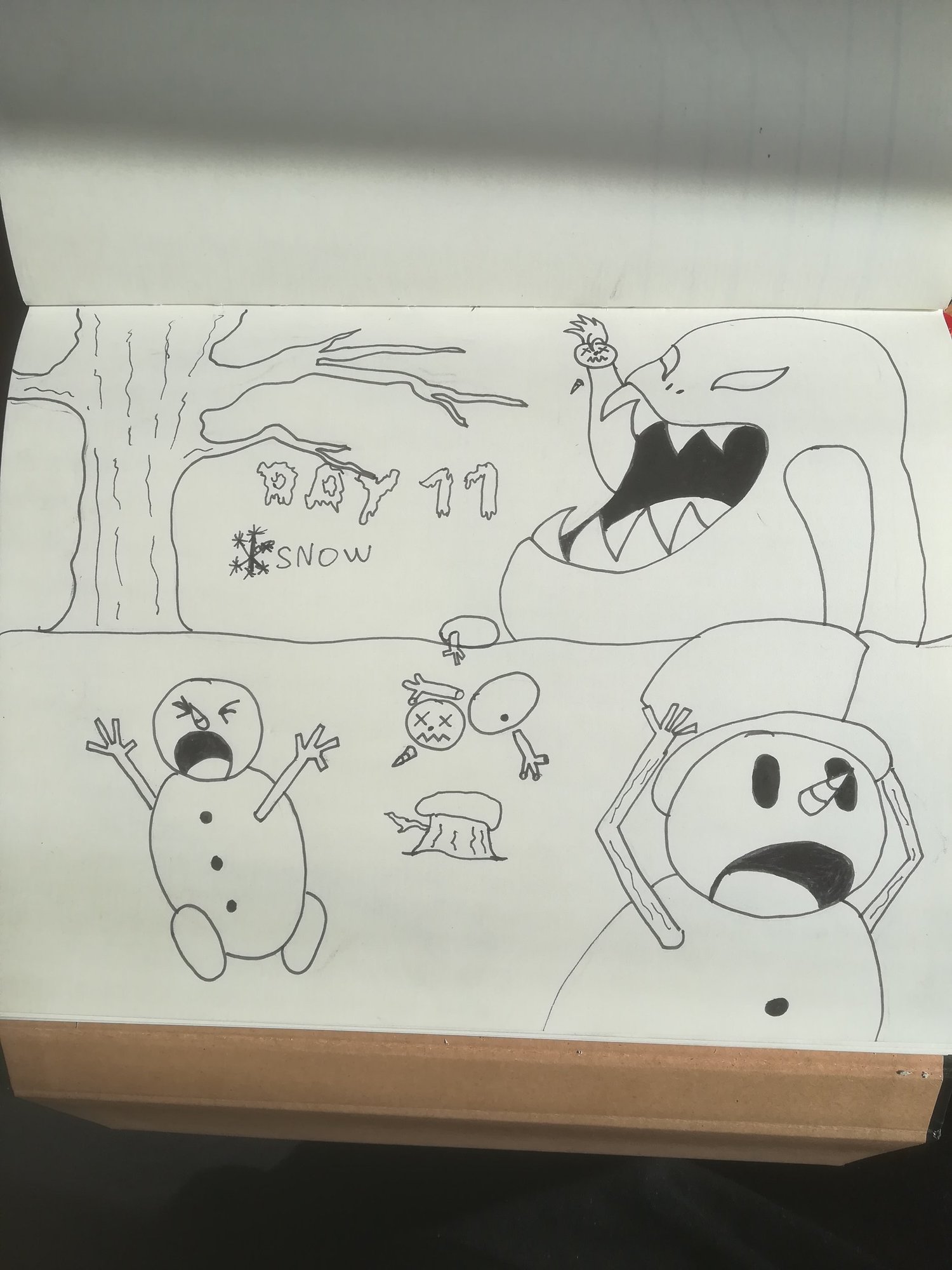 Bonjours à tous @Papakai33 on est dans le même thème haha @gohlgrinmpauvre petit bonhomme. Tend l oreille et t entendra ses os faire des claquettes @Arnovraiment très bien fait ce bonhomme de neige avec les gens. Le rendu des vêtements est sublime. Voici ma participation. Par contre je préfère prévenir elle a été fait à l arraché cette nuit durant une très longue insomnie, à même les genoux et avec une lumière quasi inexistante pour ne pas réveiller la baraque du coup c'est un peu pourri. Sur ce je vais enfin dormir une heure ou deux ! Winter is coming (ps désolée partenaire mais mon idée géniale de troll a disparu avec les 30 heures sans sommeil. Mon cerveau est trop out pour faire plus que 3 traits moches)3 points