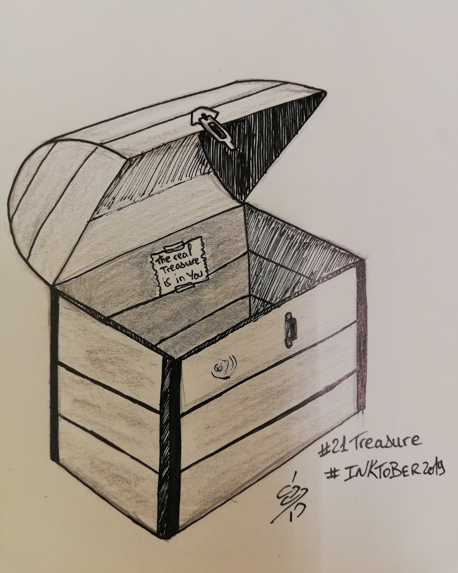 @valclay Super comme d'habitude. La composition est vraiment chouette dans celui-là. @Ares junior Haha très rigolo le doggo ! @Terra sympa le dragon mais j'ai un peu du mal à voir sa forme principale tu aurais du mieux délimiter les formes. @ycah Les chercheurs d'or de Dofus/Wakfu ! Nice ! @Stefantasy Artworks Superbe la carte au trésor, y a plein de petits détails, j'ima beaucoup. @pando Joli baybay ! 😁 @ndream Vraiment classe ton Masque de pharaon, j'avais pensé à le faire pour "Ornament". Super bien réalisé. @Baha Trop meugnon ! @gohlgrinm Classe le suqlette, comme d'hab. Il lui arrive tellement de choses, tu devrait en faire une BD ^^ @GunSlinger Super joli, l'idée est excellente. @Guertty Je t'avais oublié ! Sorry ! Très chouette ton Mimic, j'aimerai pas le croiser dans un Dark Souls ^^ @Papakai33 Le coffre au trésor, but with a twist ! Bien joué 😄 @Arno Super classe comme d'hab, la balance entre tes noirs et blancs est toujours parfaite je trouve. Voici mon trésor :10 points