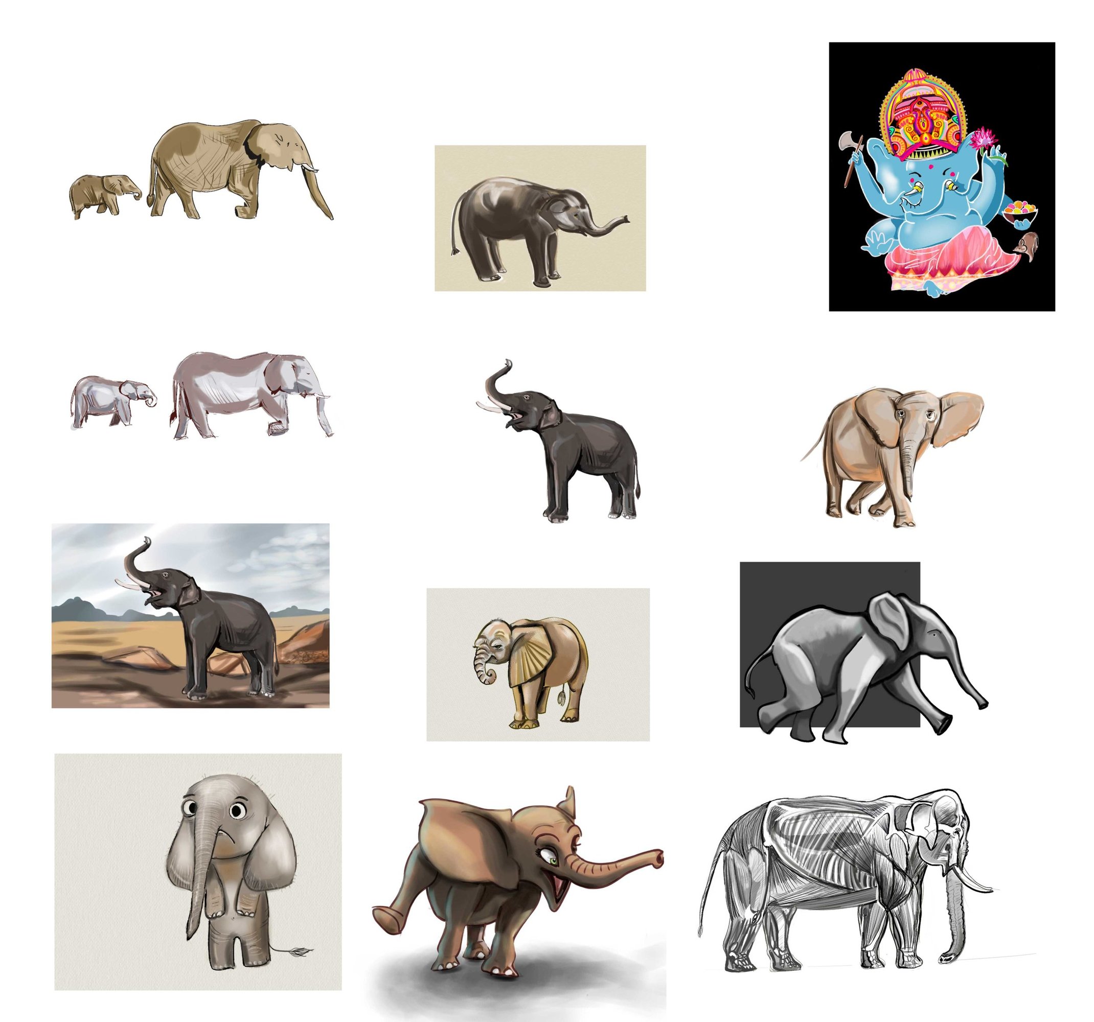 @LucasBERLIER C'est bien démarré, peut être que tu pourrais mettre le même niveau de finition sur les derniers. j'aime bien l'attitude du panda, les couleurs du dauphin mais je ne suis pas sûre des proportions de la girafe. @Tchewifull C'est bien d'abors participé (d'après ce que tu écris tu ne le faisais pas avant) J'aime beaucoup le rendu de ton chien en haut à droite, j'essayerai peut être de le refaire. @Valonia j'aime bien le rendu. C'est simple et efficace. Sur l'animal du bas, il y a peut être un petit déséquilibre mais je ne saurais pas en dire plus. -------------- J'ai gonflé tout le monde avec mes éléphants en vocal alors les voilà .. je ne les ai pas tous mis. Mes remerciements à ceux qui ont pris de leur temps pour m'expliquer à nouveau quelques trucs ( entre autres @Xavier d'Espinay Saint Luc ) J'ai pu refaire mon éléphant (au milieu de la ligne du bas) avec les ombres (mais n'ai pas refait les autres pour le moment)2 points