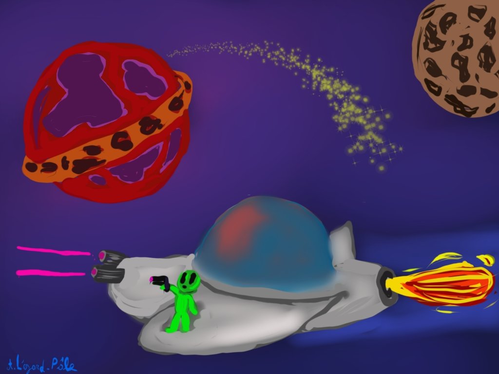 @Nogg tes illu sont sympa, j'ai une préférence pour la deuxième qui dégage une atmosphère mystérieuse très réussie et j'aime bien le traitement des nuages. La première est un peu ton sur ton, un peu plate. Il aurait fallu contraster le fond je pense. Beau boulot en tout cas ^^ @LouLoule traitement est top, plus particulièrement les rochers. Le vaisseau 6 (😄) est très réussi même si on ne comprend pas trop sa positions dans l'espace (est-il en lévitation ou sur le sol?), il fait un peu figé. Les couleurs sont sympa, le fond monochrome donne à l'image une dimension un peu stressante. Bravo. @Lydraen ahah sympa l'interprétation ;). J'aime bien le traitement des ailes, c'est ce qui ressort le plus. Le fond est bien réalisé mais il se fond avec la tête de la libellule, un léger contour ou un effet de lumière aurait peut-être atténuer cet effet. Voici ma participation. Je me suis vraiment amusée sur ce coup ^^, du coup j'ai débordé (1h15). Thème : saucisse volante alias le chien saucisse volant alias Teckel volant.1 point