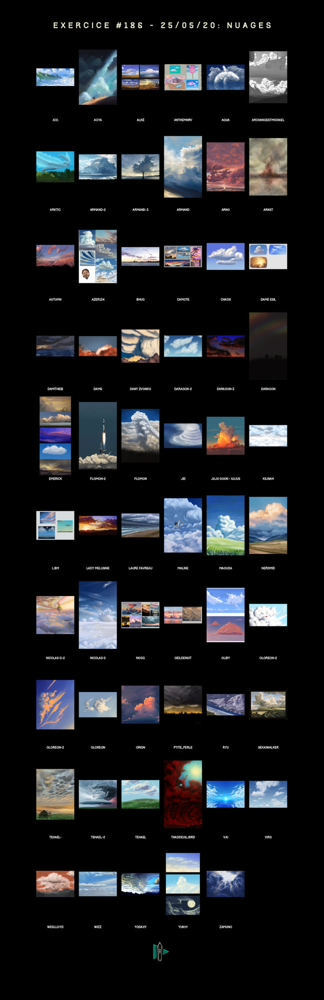 Superbes illustrations, bravo à tous ! @Nogg Très belles études. Le ciel de l'étude de l'aurore boréale me semble un peu clair, peut-être parce que j'ai souvent vu des photos de nuit de ce phénomène... @damithieb Bravo pour ta première participation, n'oublie pas de commenter les illustrations des autres la prochaine fois 😄. C'est un bon début, les nuages manquent un peu de variations de couleurs et de volume. @aqua Belle image ! En amélioration je me dit que ça pourrait être chouette que les nuages qui forment la baleine suivent la forme du mouvement du plongeon, comme si ils enveloppaient une véritable baleine entrain de sauter, en variant les bords durs et doux. Je trouve le thème de cette semaine très chouette, j'avais projeté de faire plusieurs études mais finalement en voici une seule ^^ :3 points