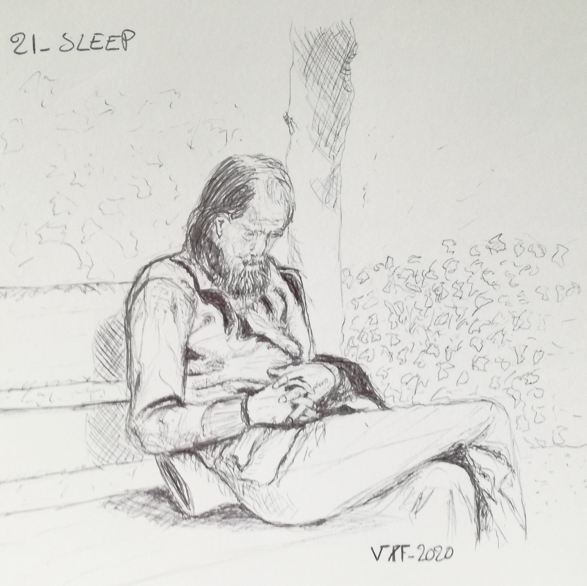 Bonjour à tous, Ma participation du jour. Au stylo bille pendant la pose déjeuner. @Bibulle Ah vivement les vacances. Y'a quand même quelques détails! 👍 @LauraChouette atmosphère. Je peux pas t'aider pour le liquide de masquage. J'en ai jamais utilisé. @snaaze Voilà un sommeil perturbé. C'est peut être parce qu'il penche du côté où il va tomber? 😄 Tu devrais mettre un point de fuite imaginaire à droite et tu te rendrais compte que tes lignes partent trop vers le haut. En même temps ça marche bien avec le sommeil du personnage. @GuerttyTrès chouette! 👍8 points
