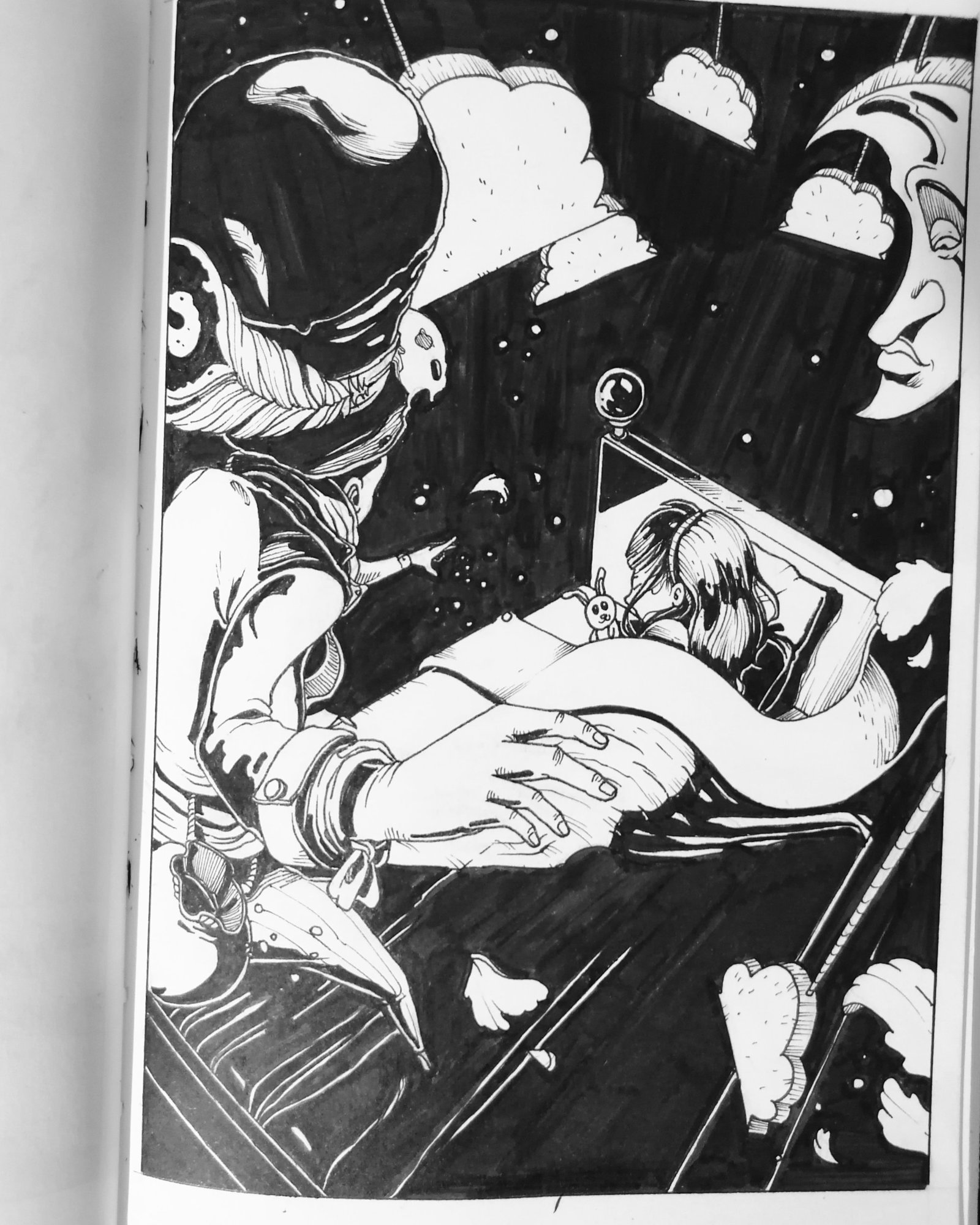 @snaaze il y a un style a creuser 😉 ...regarde des références pour les perspectives isométriques ...j'aurai bien vu quelque chose dans les nuages noirs... @Laura sympa l'idée de la toile ..j'y pense aussi pour un futur thème j'aurai bien vu les perso les yeux pour quon comprenne qu'il dort @Bibullela perspective est réussie et j'aime bien l'idée globale, j'aurai bien vu une différence de profondeur plus marquée entre le fond et le premier plan Jour 21 ça vous est arrivé cette situation? faites le moi savoir ;-)...je suis le seul dans ce cas??? sinon j'en ai profité pour tester la fameuse plume G des mangakas du soleil levant ...pas évidente a maîtriser....bref qu'est ce que je peux faire pour demain????9 points