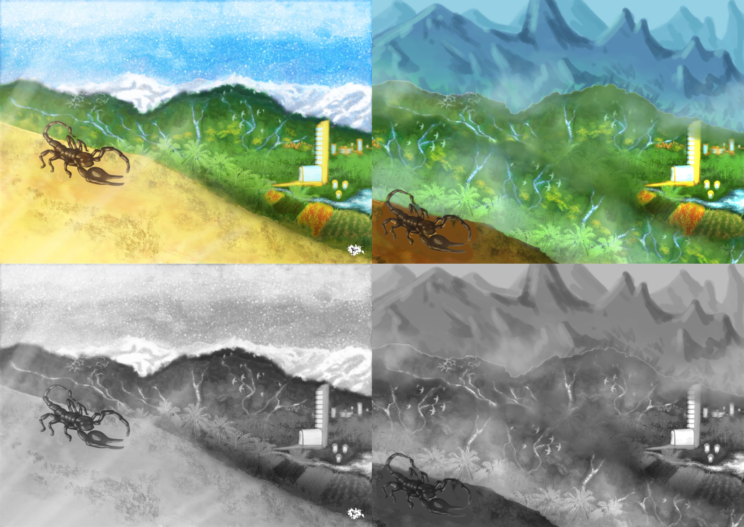Sympa le regard de la fée @Didier Ra, je mettrais juste un ptit bémol sur le voile que je trouve un peu rigide au niveau du rendu, mais c'est un beau portrait sinon 😉 @poltuposing dynamique et sympa, c'est cool, une belle highlight sur le dos. Moi je commence le mountain octopus, jvais essayer de poster plus de Wip pour me motiver à être régulier, donc apres quelques recherches de design papier, j'ai fait quelques test de compositions, jvais partir sur une pieuvre géante qui fait parti du décor avec un corps plutot rocailleux J'hesite entre le 3 et le 4 pour l'instant Quelques bases de valeur, jsuis pas tres convaincu pour l'instant1 point