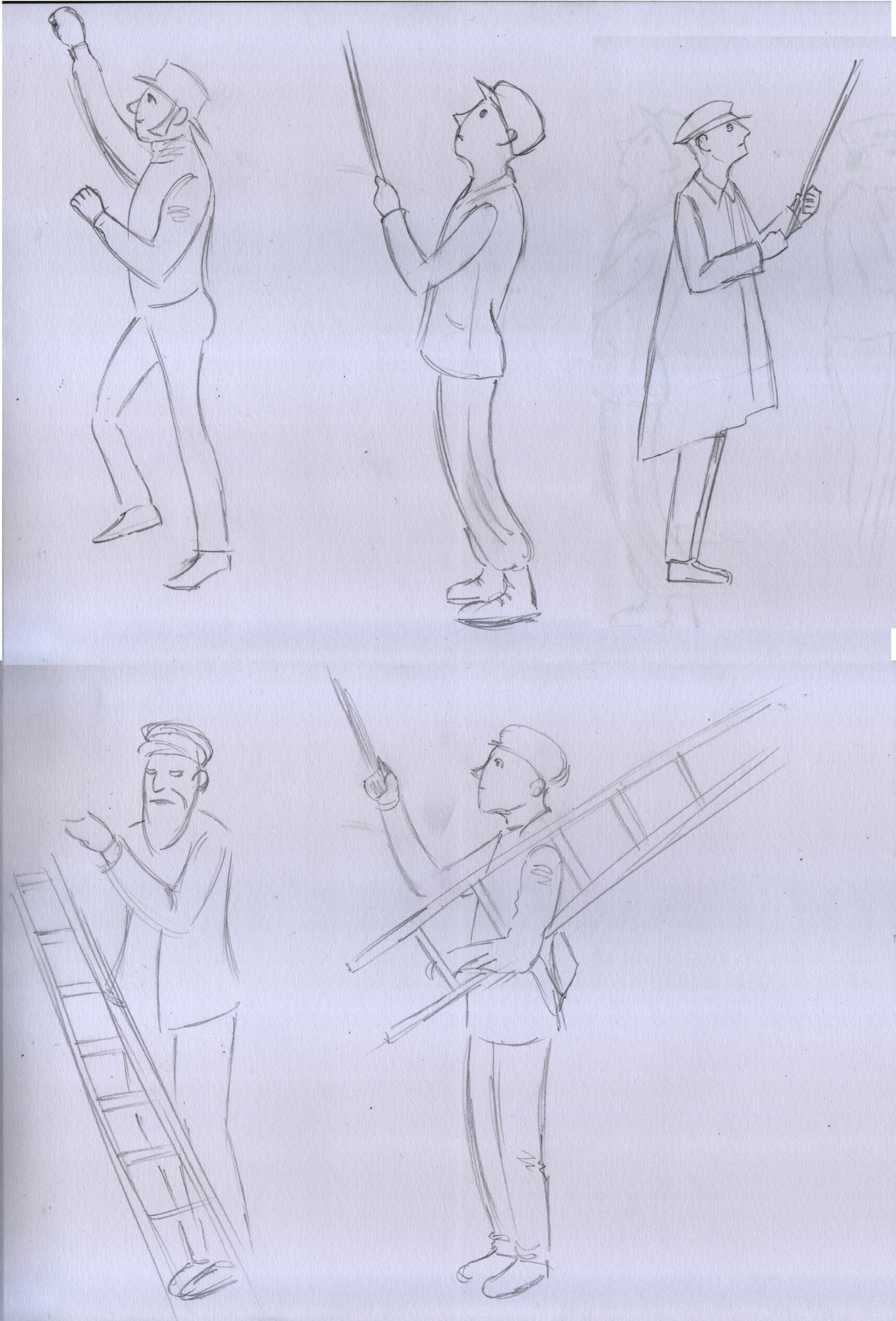 @edamelLe personnage de dos a le torse un peu bizarre, mais les autres sont chouettes. @HieronymosJ'aime beaucoup le croquis de samouraï. Les autres me semblent avoir des traits un peu mous. @AzaelisCool d'avoir tout fait en digital. Tu n'as plus qu'à les imprimer pour les coller dans ton carnet de croquis ! C'est dommage qu'il n'y ait pas les visages sur les croquis de femmes, je les trouve sympa au niveau des poses. Je suis en train d'essayer de créer un personnage d'allumeur de réverbères qui sera ensuite modélisé en 3D. J'avais commencé des croquis de personnages cartoon complétement d'imagination, mais ils sont astrès moches. Ensuite, j'ai croqué très vite et en stylisant le plus possible d'après des photos anciennes. Je referai des croquis d'imagination plus tard. C'est fait sur papier, au HB. J'avais fait des essais de silhouettes cartoon en DP mais on dirait que je ne sais plus tenir un stylet, c'était trop moche !1 point