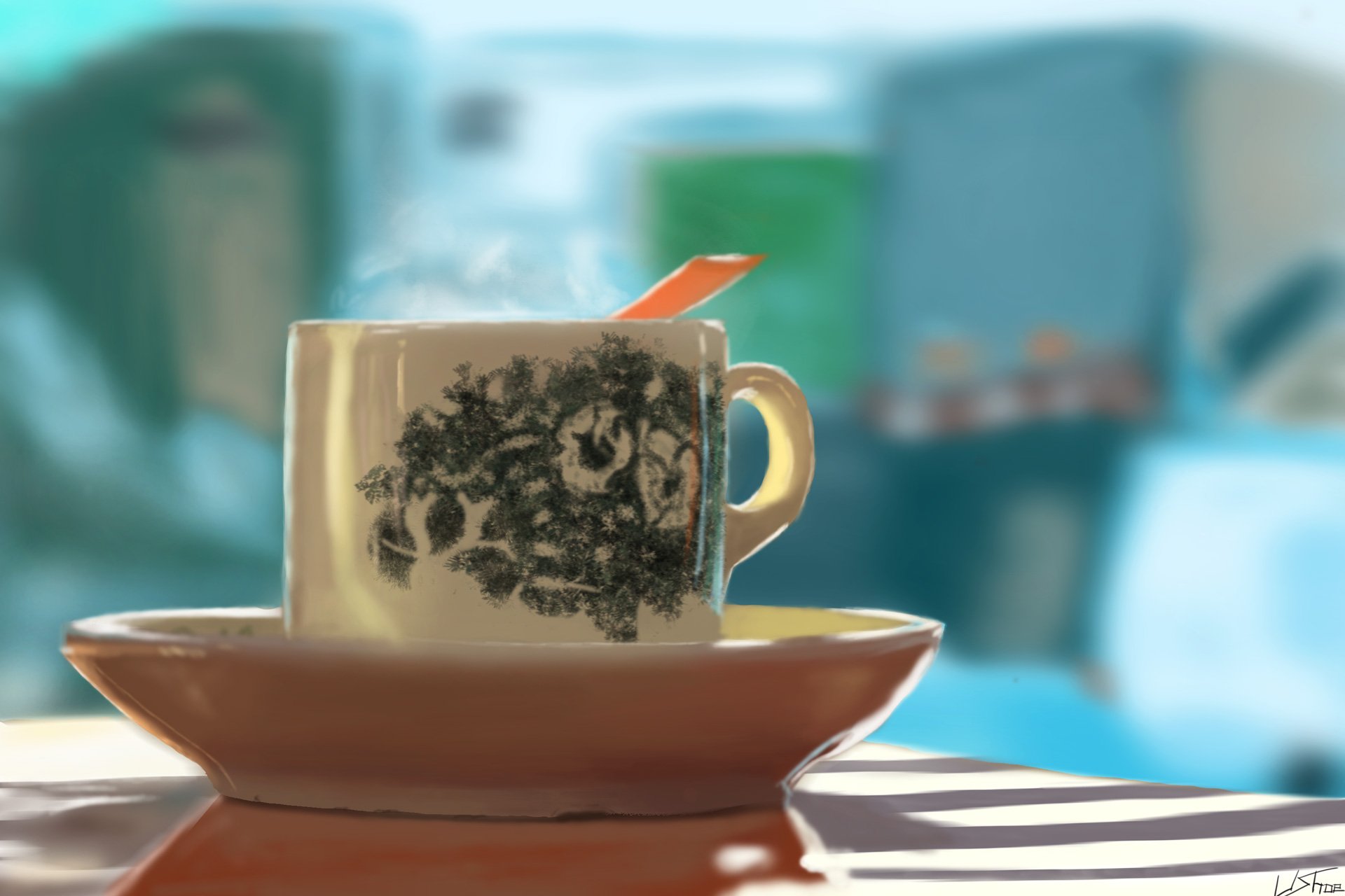 Bonjour tout le monde ! Merci @ShozArt pour le retour. je vais le retravailler encore un peu. J'en profiter pour poster ma version de la tasse ; qui était assez éprouvante et en même temps très intéressante à réaliser. J'ai déjà eu un retour sur la cuillère qui est "étrange". Je suis assez d'accord avec cet avis mais je ne vois pas comment l'améliorer. Idem pour la fumée qui est peut-être un peu faible, mais je n'ai pas trouvé de meilleure solution. Je suis preneur de tous conseils :) Bonne soirée à tous1 point