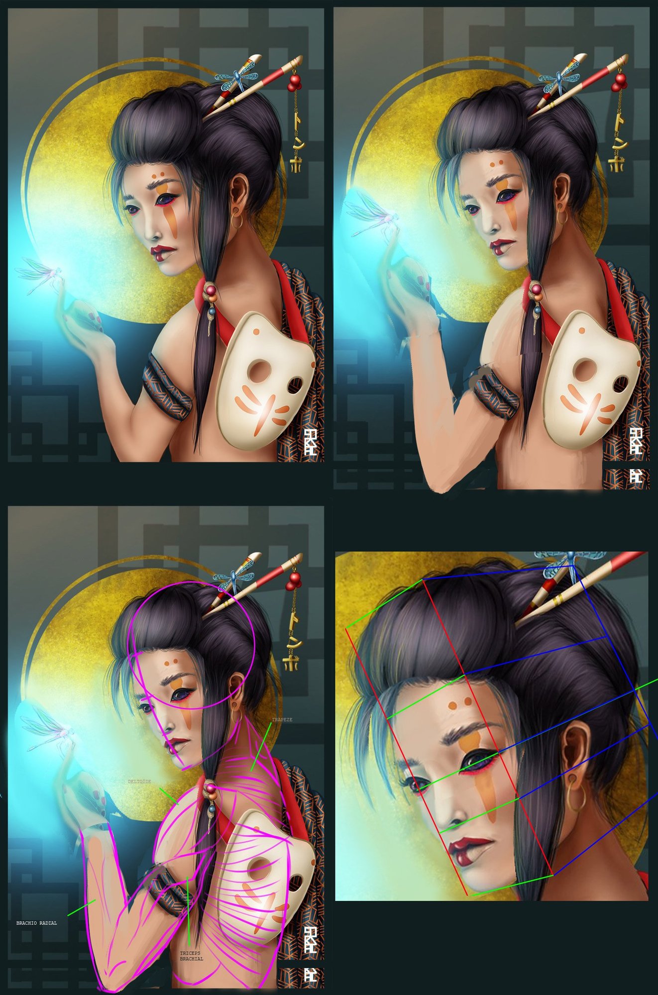 Bonjour SOKAPIC et bienvenue. Ton illustration est superbe, félicitation. Je me permet d'apporter quelques précisions: tu noteras que je n'ai absolument pas redessiné sur ton portrait, j'ai simplement utilisé photoshop pour reprendre les proportions. Notes également que je ne suis qu'un amateur, tu auras les correctifs des pros sur la suite du programme. -J'ai réduis la taille de la boîte crânienne et le muscle de la joue gauche (masséter). -descendu les yeux et augmenté la longueur du front. -Placé la tête dans un cube en perspective pour aligner le nez, la bouche et la ligne des sourcils . -remonté l'épaule pour faire apparaitre le deltoïde et descendu le coude au niveau du nombril. -augmenté la taille de la main pour que celle-ci puisse "englober" le visage (la paume de la main doit pouvoir se superposer au menton et les doigts atteindront ainsi le haut du front). Ton niveau en peinture me paraît très bon, impatient de voir la suite de ta progression. Si tu veux progresser en portrait, il y a la chaine youtube d'Angel GANEV, c'est quelqu'un d'un peu "fou" de prime-abord mais un des meilleurs portraitiste en digital.1 point