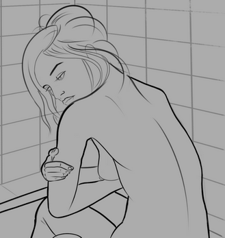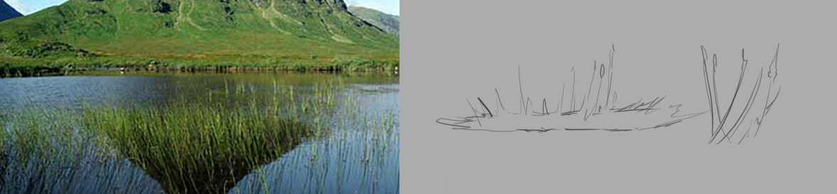 Du très bon boulot en effet, belle mise en couleurs également. Ceci dit attention à certaines des tes proportions, par exemple sur le croquis de la femme sur la baignoire, le dos à droite me semble un peu tordu L'épaule à droite est trop prononcé et la colonne trop marquée et trop haute au niveau de la nuque. Pour les proportions je te conseil d'utiliser le miroir : Image > Rotation de l'image > Symétrie de l'axe horizontal. Ça retourne ton image et te permet de voir les erreurs auxquelles tes yeux s'étaient habitués. Sinon tu peux placer la photo en superposition en transparence pour localiser tes erreurs, (à faire avant l'étape 3) Ici le but est juste de vérifier et non pas de tracer par dessus. Concernant la montagne, je pense que tu peux suggerer le reflet dans l'eau également, pour la végétation en 1er plan, essai plutôt de définir cela comme des formes plutôt que des traits. Un exemple très rapide mais pour te donner un idée.: Pour la mise en page, je te dirai d'espacer un peu plus les croquis, histoire qu'il ne se chevauchent pas les un des autres.1 point