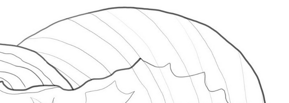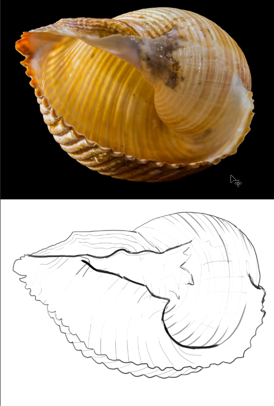 Beau progrés pour le coquillage, on voit que tu commences à bien comprendre le process, il y encore quelques approximations mais rien de bien grave. Par exemple tu as encore un peu trop de détail, notamment sur cette zone On a encore du mal à definir le volume, car même si tu as plutot bien suvi la forme, le placement est encore un poil maladroit. Par exemple si je prends le dessus de ton coquillage, tu as bien repéré les nervures mais tu n'as pas respecté l'orientation et le nombre de nervure, même si il ne faut pas tout dessiné, il faut respecter au mieux ces details pour avoir de la cohérence dans ton dessin, aussi je t'invite à utiliser l'option lissage en haut dans tes paramètres lorsque tu utilise l'outil pinceau, ça te permet d'avoir plus ou moins de souplesse dans ton trait, car celui-ci me semble un peu tremblotant par moment. En effaçant quelques lignes et en rectifiant l'inclinaison de nervure, on commence à avoir un croquis plus comprehensible Il faut également penser au transition progressive, je vais te montrer l'exemple avec la peluche dragon que je partage aux éléves: Tu vois, le trait n'a pas la même épaisseur tout le long , cela te permet de donner un peu de variation et d'accentuer tel ou telle forme, par exemple sur le bas de ton coquillage tu pourrais utiliser cette variation. Ça me semble mieux pour tes oisillons :), continue comme ça!1 point