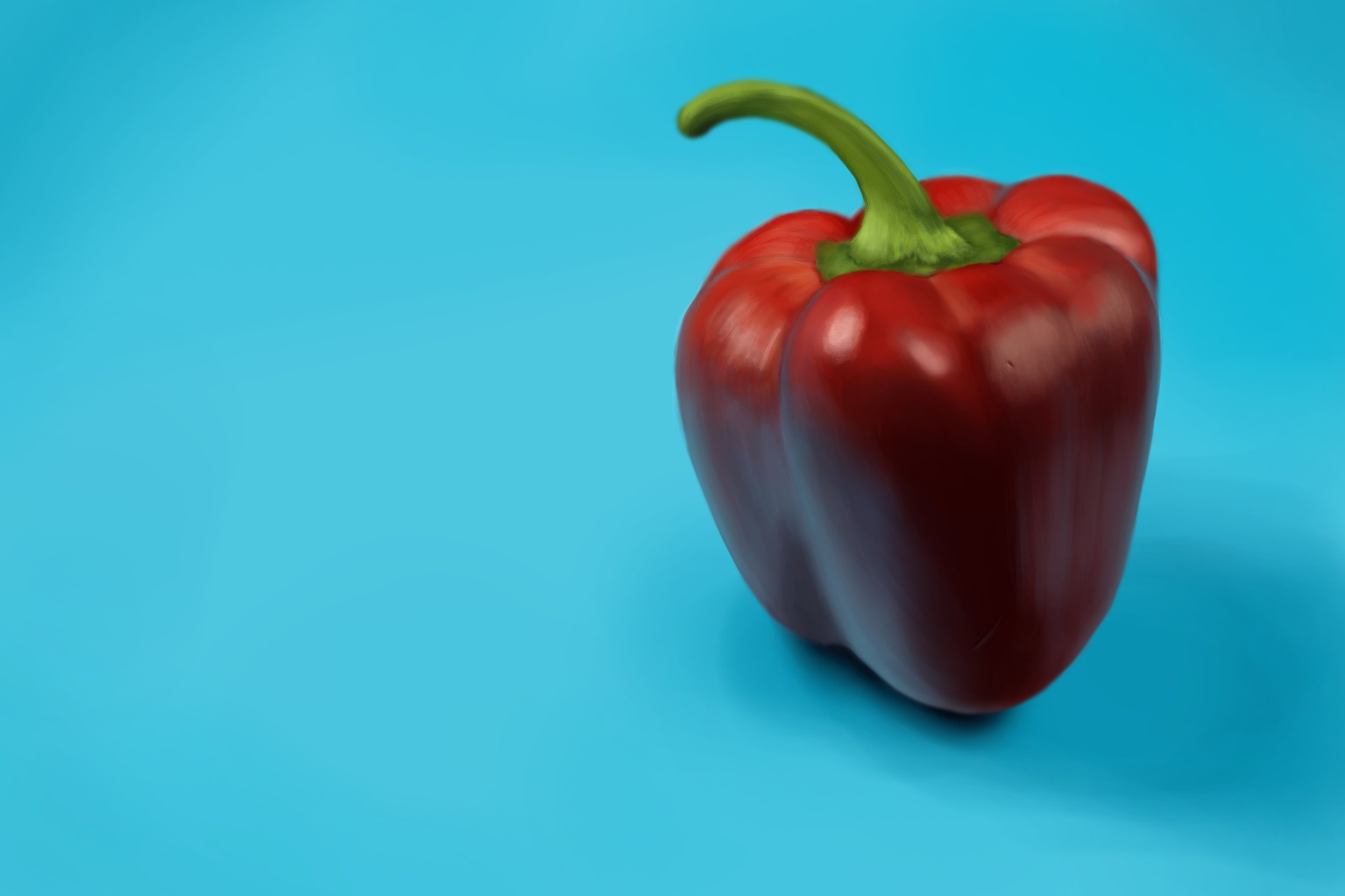 Hello ! Alors c'est un peu mieux pour les montagnes mais c'est vrai qu'on est en réalité sur des couleurs beaucoup plus pales, bleutées moins saturées et moins contrastées. : quelque chose de dans ce gout là : La rose c'est vraiment pas mal, on est beaucoup plus fidèle sur les couleurs même si on retrouves un peu ce contraste excessif, essaie de faire attention à ca pour les futurs paintings. T'en fais pas, tu es là pour ca, ca va s'améliorer avec la pratique 😉 Le poivron est vraiment pas mal, je dirais que le bout de la tige est un peu trop contrasté encore une fois 😉 le bout est trop dark ici : Niveau couleurs, le rouge ici manque un peu de vivacité il est un poil "grisonant" et désaturé voici l'original : Pour le reste c'est vraiment pas mal, continue !1 point