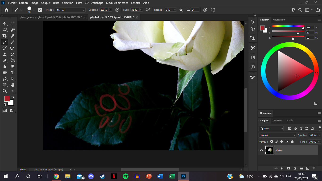 Bonjour, déjà merci pour ce message, c'est très encourageant ! Ensuite pour la feuille, j'ai peur de ne pas beaucoup t'aider car moi-même je ne me souviens plus trop du processus derrière sa création. Je l'ai fait à travers un processus de "trial and error" mais je peux toujours essayer d'expliquer les grandes étapes. Pardon d'avance si mes explications ne sont pas clairs 😓 : 1. Sur un calque que je nomme "grande feuille" pour ne pas me perdre, je sélectionne au lasso la feuille ainsi que le début de la petite tige. Là, j'applique les grosses couleurs qui sont le verts foncé indiqué dans le calque "couleur" ainsi que qu'un vert très foncé allant vers le noir pour l'effet d'ombre. Pour ça, j'utilise un brush texturé comme "carré craie texturé" qui, je trouve, marche très bien pour le painting en général. 2. Ensuite à main levée, j'essaye de tracer au mieux les lignes de la feuille (celle du milieu et celles qui vont aux extrémités de la feuille) avec le même brush et ceci avec plusieurs couleurs pour les faire ressortir. Par exemple, j'ai choisi une couleur plutôt sombre ainsi qu'un vert plus clair que j'ai ensuite superposé. Je place aussi ces lignes dans la parties "ombre" en diminuant la pression. On peut aussi changer de vert clair s'il est trop visible par rapport à la photo. 3. Après, je me suis attaqué aux détails comme les parties bleu~verte. Pour ces dernières, pour donner un effet texturé et éparpillé (pour que cela ne fasse pas de gros coup de brush distinct) j'ai utilisé un custom brush " brush texturé 1". J'ai sélectionné les zones bleu~verte au lasso pour ne pas dépasser puis je suis passé légèrement une première fois avec le brush pour donner une couleur très légère. (pour un résultat optimal, il faut repasser plusieurs fois mais très légèrement). Pour les parties plus saturées, j'ai juste appuyé un peu plus fort tout en essayant de rester fidèle à la photo. Pour le bout de la feuille, j'ai repris mon brush texturé de base, sélectionner au lasso puis choisis un bleu plus clair (ou à la pipette directement). 4. Alors c'est ici dont je ne suis plus vraiment sûr du procédé exact (pardon d'avance) J'ai commencé à m'occuper des petits détails comme rajouter des parties un peu plus sombres au lasso, je pense par exemple à la partie supérieure de la feuille ou au petit coin gauche. C'est aussi ici que je commence à mélanger les couleurs (je ne sais pas si c'est le bon terme à utiliser ici) notamment les transitions entre le bleu~vert et le vert plus foncé de la feuille. Je pense avoir utilisé un brush très soft pour cette partie pour effacer les coups de brush visible en plus de donner une transition moins brutale entre les couleurs. Ce processus ce fait pour tout les transition de couleur. (Aussi, il ne faut pas trop appuyer pour ne pas donner un aspect trop lisse à la feuille). Après avoir un résultat satisfaisant au niveau du mélange, je peux toujours repasser un coup de brush texturé notamment sur les petites branches si elles sont trop effacées. 5. Normalement, les couleurs devraient être homogènes. Cependant dans la photo, entre les branches, on peut voir vers le centre des parties plus claires. Je repasse donc très légèrement avec le même brush texturé du début sur ces parties en ajoutant des couleurs un tout petit peu plus plus claires pour donner l'effet de la lumière reflétant sur la feuille. On peut faire cette étape à main levée mais l'utilisation du lasso facilite la tâche. 6. Sur un autre calque que je nomme "lumière" et que je mets en calque d'écrêtage pour ne pas dépasser, je change son type en "densité couleur -". Ici, je rajoute avec un vert très clair des coups de brush très léger pour rajouter de la luminosité à la partie inférieure de la feuille et pour contraster avec la partie supérieure. Aussi, on peut rajouter des coups de brush sur les parties claires que l'on a ajouté dans la partie 5. Il faut y aller avec parcimonie car le mode de densité de couleur- rajoute beaucoup de lumière et ceci très vite. Voilà pour mon cheminement approximatif, je ne sais pas si cela pourra t'aider et je pense que des personnes beaucoup plus compétentes que moi pourront te fournir de véritables explications détaillées. De plus, je pense que mon procédé est loin d'être le meilleur et peut vite devenir très chronophage si on s'attarde aux détails. En espérant que ce message pourra tout de même t'aider 😄1 point