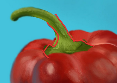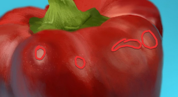 Hello, Il est pas mal du tout ce poivron, bravo ! Pour les petites corrections, tu peux accentuer les rehauts du lumière ici : Et c'est bien d'avoir utiliser un flou pour la tige, mais tu aurais pu en flouter encore plus pour bien rendre la profondeur, car tes bords ici sont un peu durs : Pour le reste c'est vraiment bien, ta texture est très réussie. 🙂 Continues comme ça !1 point