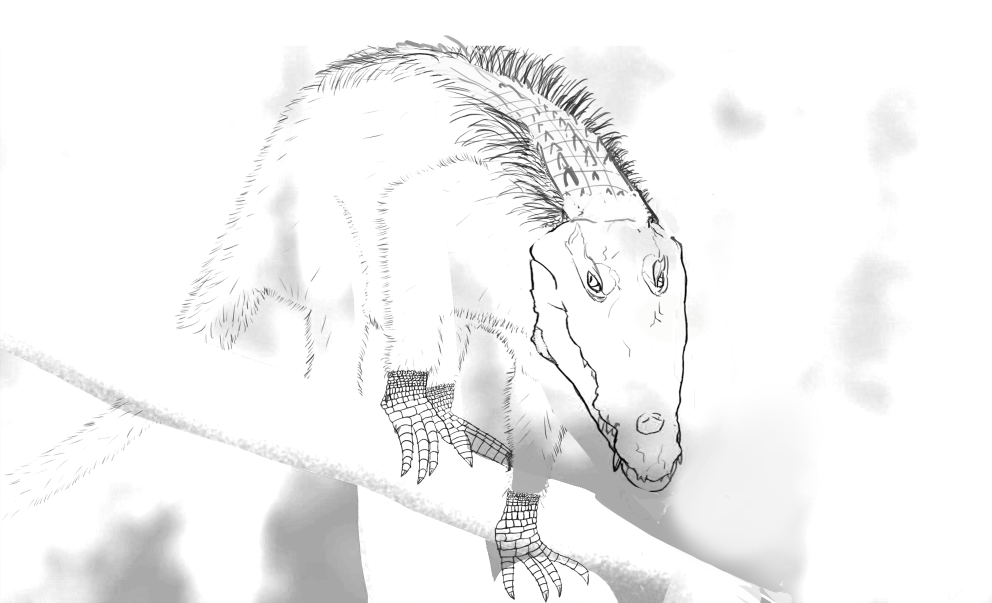 Hello, Haa c'est bien mieux, attention à donner un peu plus d'espace au-dessus de ta chimère, certes sur la photo l'animal est collé au bord, mais pour le coup, tu peux te détacher de ta référence pour cela. Tout comme la branche à droite, tu peux l'enlever, car elle n'apporte pas grand-chose finalement à la composition. Je trouve la tête de la chimère un peu trop serrée, trop plate. Je l'élargirais un peu comme ceci. En effet, les écailles sont un peu trop vue de dessus, aussi pour le moment ne rentre pas trop dans les mini détails lorsque tu n'es pas totalement sur de ton croquis, sinon c'est plus compliqué de tout corriger ensuite. Voici une rapide correction1 point