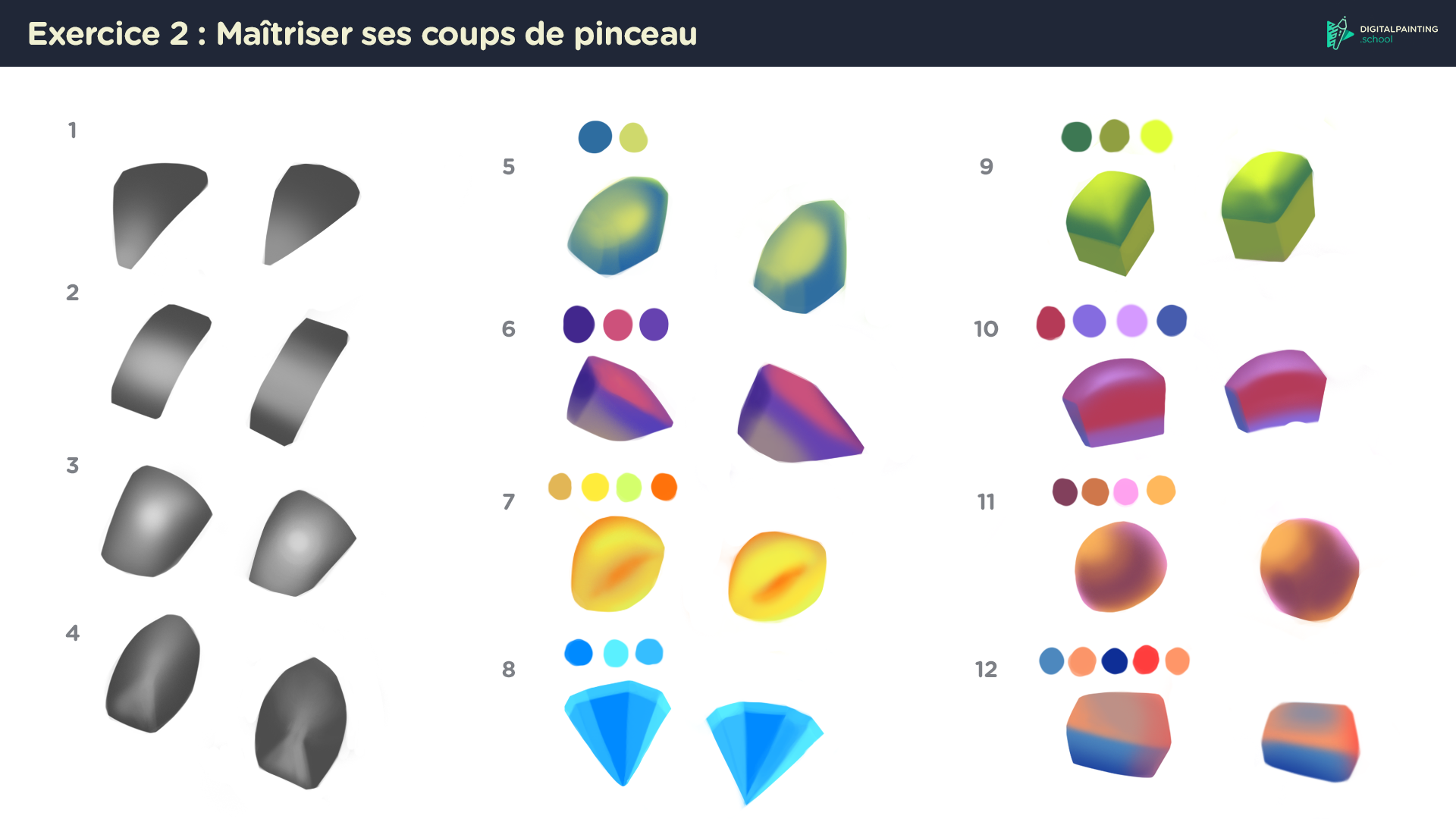 Bonjours a tous, Voici les premier rendu des exercice du chapitre 1: Les brush. Pour cette exercice j'ai un peux galérer sur les forme 4 et 5 (surtout la 4), j'ai beaucoup de mal a choisir les option de brush pour bien refaire le même coup de brush, sur la 5 c'était ce qui m'avais pris le plus de temps et d'essais, pour le diamant je pense que je me suis gouré sur les étapes, j'ai commencé par le bleu foncé alors que je crois que faire l'inverse aurait été plus simple. Bonne Journée / Soirée.1 point