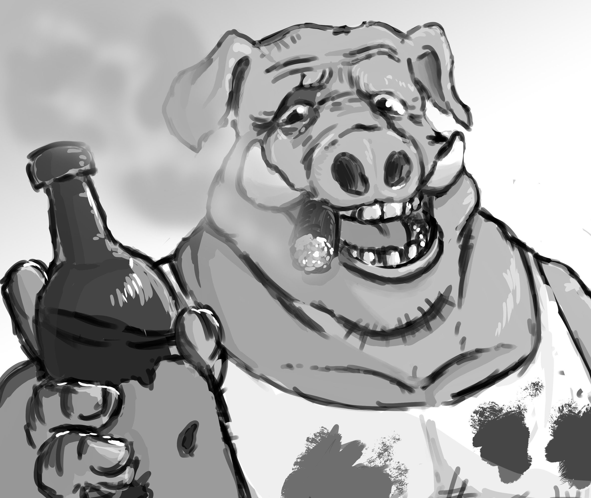 Bonjour à tous ! Pour ce premier exercice, j'ai décidé de m'inspirer du personnage de Pey'j du jeux vidéo Beyond good and evil, car un personnage anthropomorphe surtout un cochon m'amusait plus à désigner et à peindre qu'un humain dont j'ai des lacunes sur l'anatomie même si j'arrive à faire un portrait correct de temps en temps. J'ai essayé d'aller le plus loin possible pour cette illustration mais il faut accepter le niveau qu'on a et s'arrêter. C'est pour cela que c'est que du noir et blanc car vraiment la couleur impossible pour moi pour l'instant. Mais malgré tout, je suis quand même fier de cette première tentative sur photoshop ^^ (car avant j'étais sur Krita et Clip studio paint). En tout cas, j'ai très hâte de lire vos retours !1 point