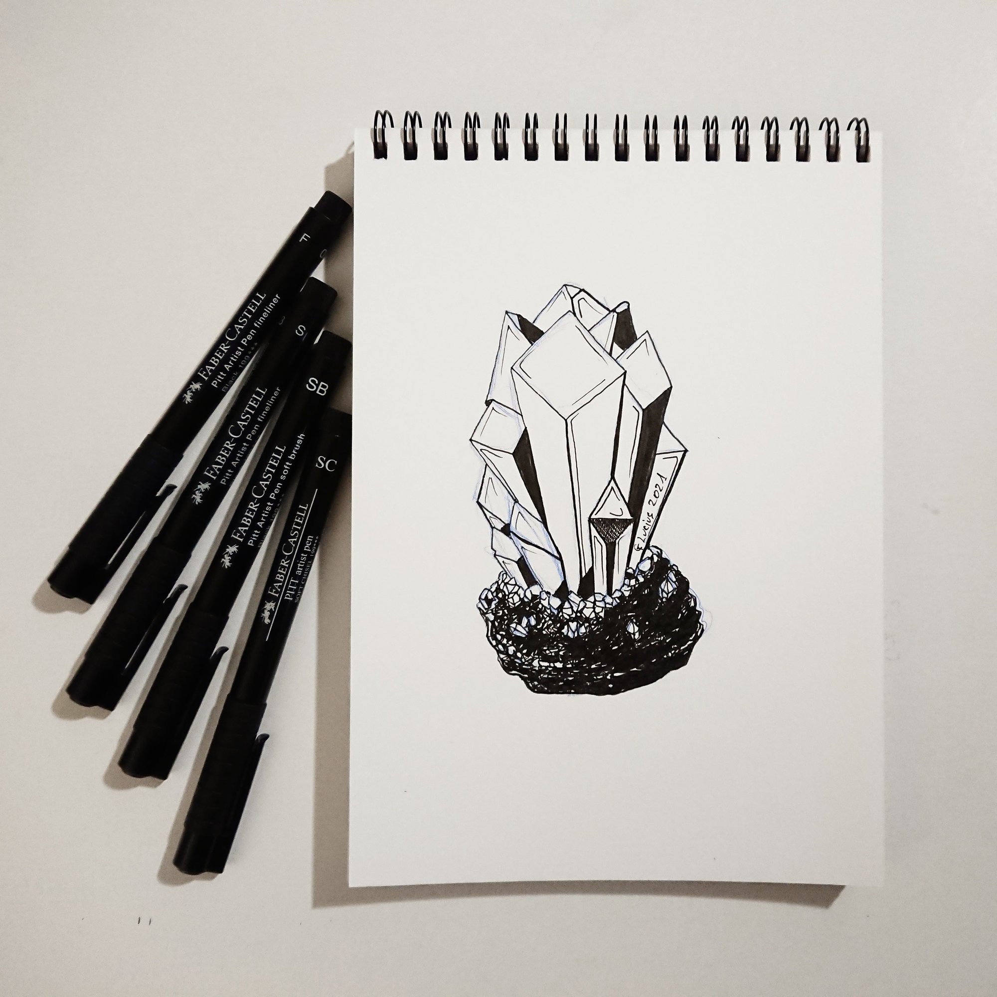 Hello, Bon, je suis à la bourre. Je vais essayer de vous rattraper. @debyed Très sympa. J'aurais bien vu plus de variation de densité des points, pour simuler un peu la lumière différente sur les facettes. @Lucius Sympa. Des petites hachures ou des points pour simuler un gris auraient ajouter un peu de volume, je pense (les faces soit complètement noires ou blanches font un peu trop 2D). @SKARR Cool. Les gros traits contrastés ont tendance à attirer le regard sur la droite, avant d'avoir vu le cristal. Mais c'est cool, bon style. Voici le miens. Merci beaucoup d'avance.2 points