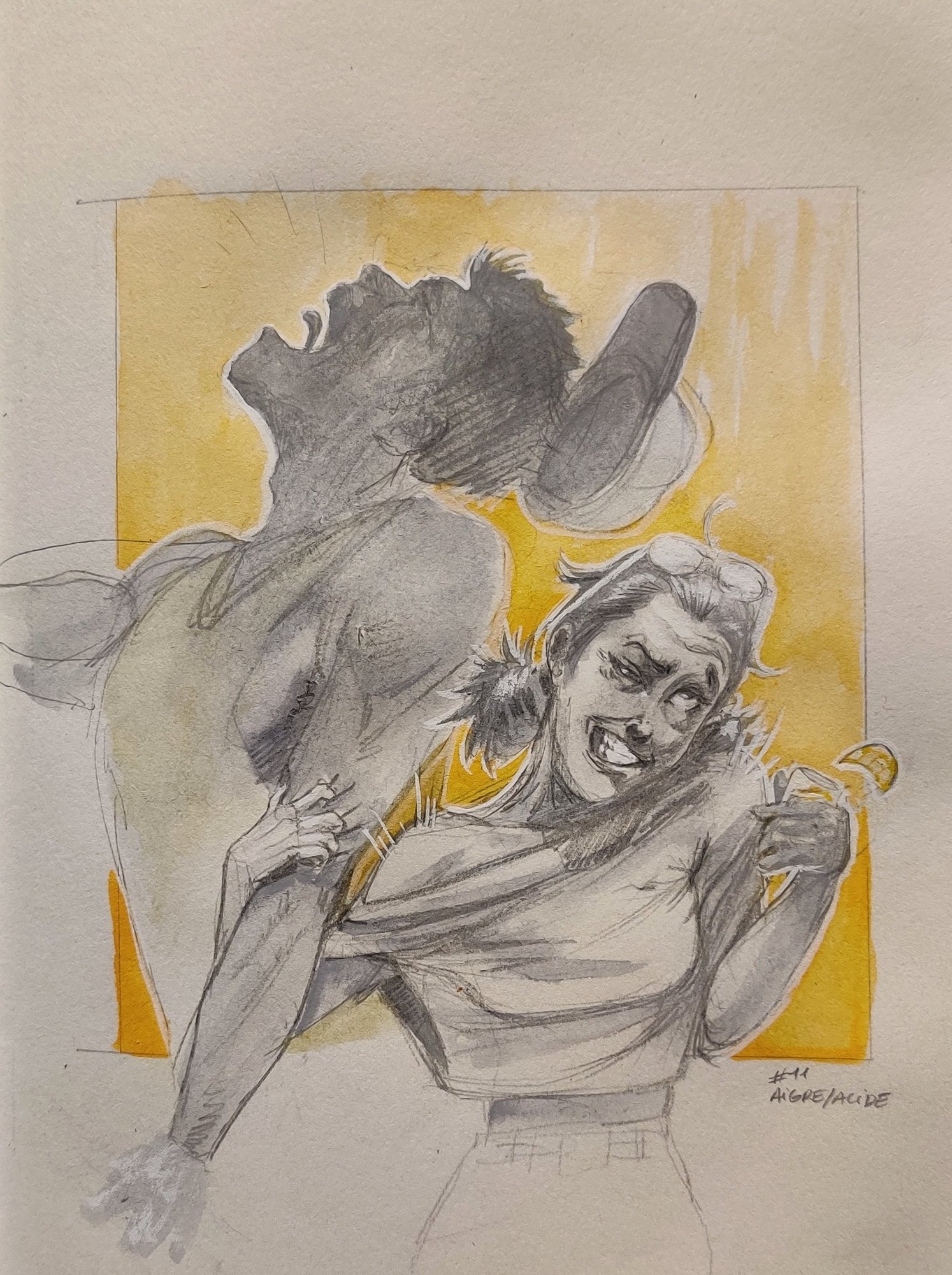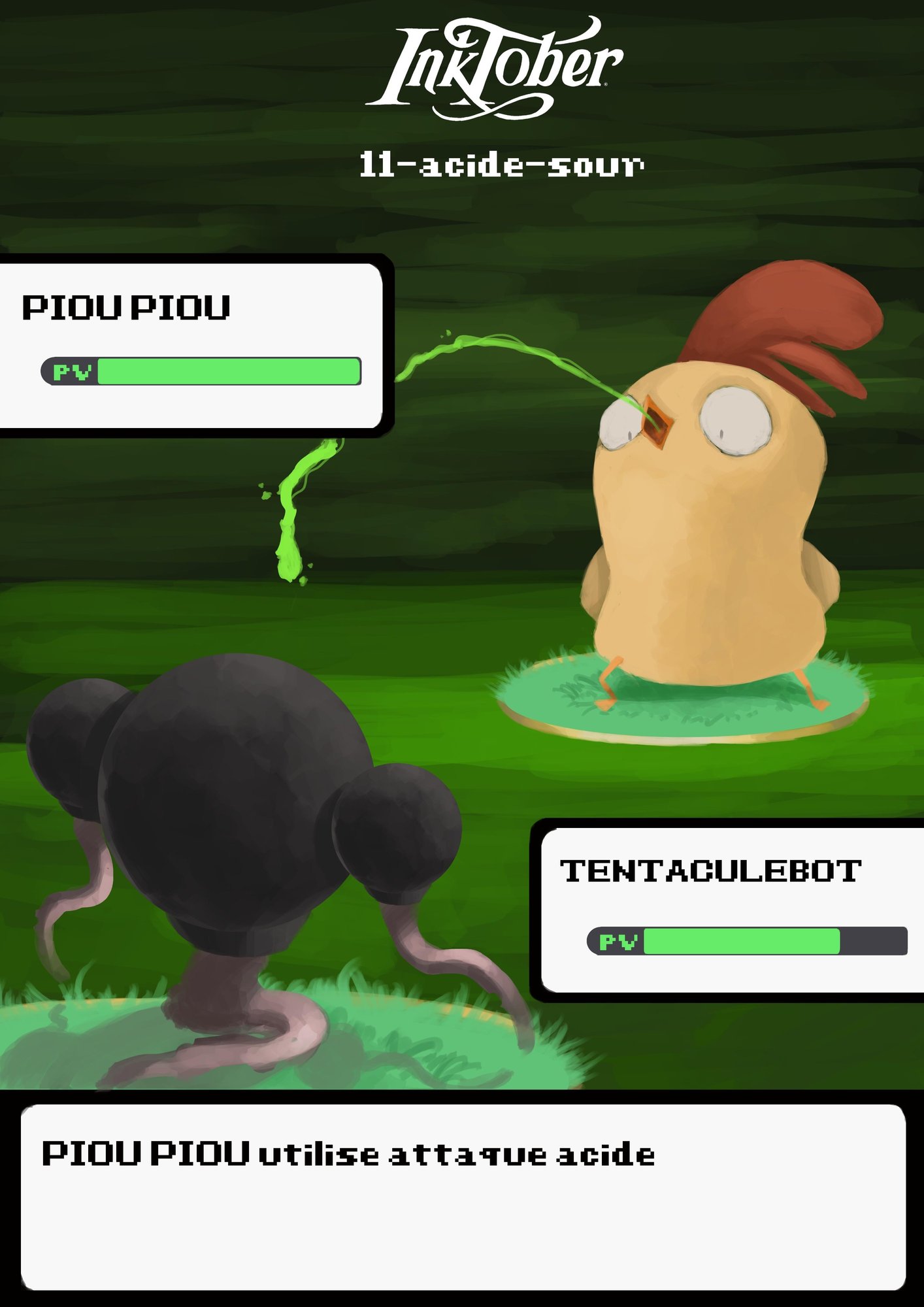 Bonsoir! @AdraPeut-être peu de temps, mais tu nous sors un digi superbe! Je ne sais pas s'il s'agit d'un OC ou d'un personnage déjà existant, mais j'aime beaucoup le char- design de celui-ci! @Guertty Horrible l'acide, parfaitement dans le thème et bien gore, on adore ça! @ArkticAhh, te revoilà avec un autre décor digne d'un film de science fiction...horrifique? Belle gestion de la lumière de l'acide en tout cas! Pour ma part, on continue le petit défi perso de "ne pas lever le stylet" (pour info, je réalise quand même un sketch rapide avant afin d'avoir une vue globale du dessin...sinon, c'est impossible ahah)4 points