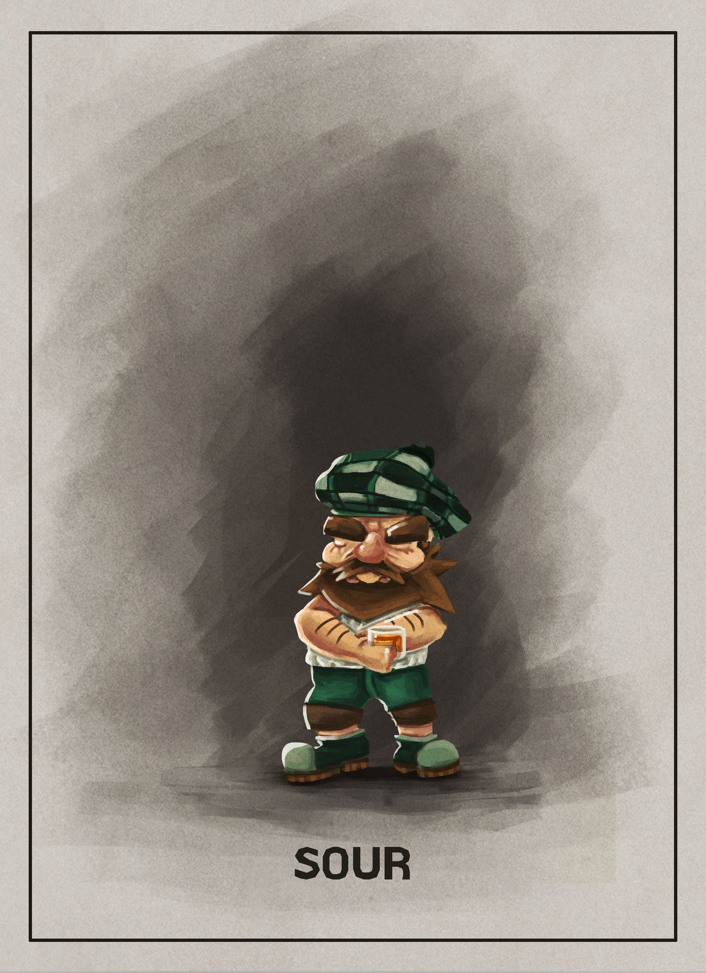 @DragonyaSympa comme challenge, sachant que c'est loin d'être évident ! En plus tu fais une petite table, des insectes et tout... @Haeresis La fameuse cube, j'avoue que j'y avais pas pensé. Joli boulot d'avoir rempli toute la page au passage @Deny Très très cool ! D'une part pour le nombre de persos d'autre part pour le style ! Ça me fait pas mal penser au jv "Pilgrims" d'alleurs Bon, "sour" est pas le mot le plus simple pour un challenge spé chara design mais soit. On part sur "aigre" autant avec l'expression (?) que le ptit whisky6 points