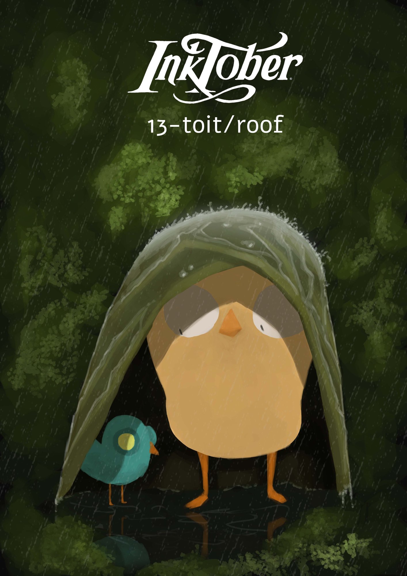 Hello 🙂 @Adra Bien vu la petite lampe de poche dans la bouche en mode exploration 😉 @Lykkelig Comme Adra j'aime beaucoup ton choix de persp, et l'idée en elle même. @Guertty Nice, j'aime beaucoup la compo, ça fonctionne bien mais c'est vrai que si jamais tu penses la continuer après l'Inktober ce serait chouette ! Bon je me suis lâché sur celle-ci, changement complet d'approche XD J'ai pensé a un toit végétal, ça faisait un long moment que je n'avais pas fait un peu de pluie c'était l'occasion. Je pensais rajouter un autre personnage pour un peu d'interaction avec l'autre caché sous les feuilles mais finalement j'ai laissé comme ça.3 points