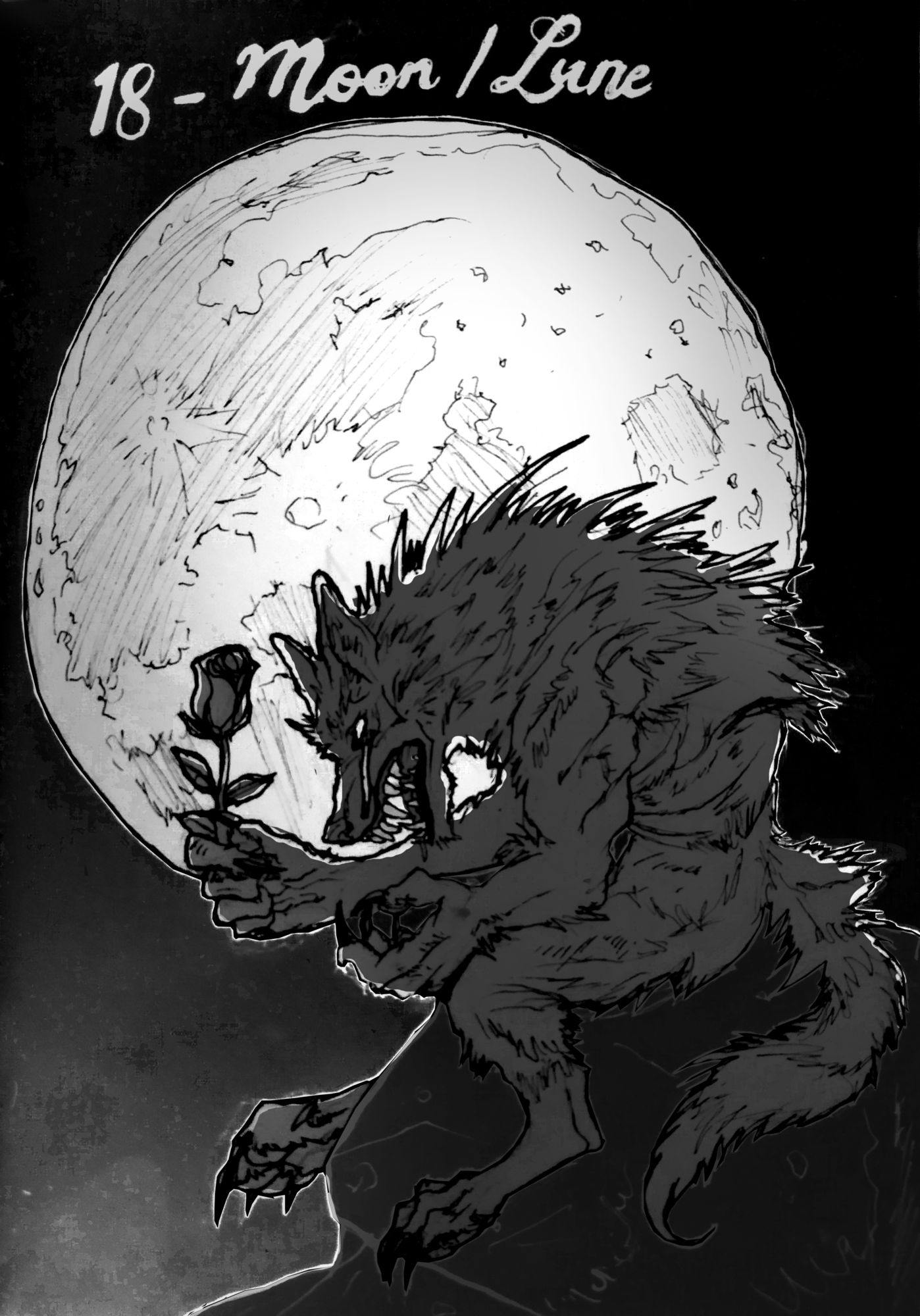 Bonsoir tout le monde ! @Arktic Scène très cool ! On dira une histoire à raconter aux enfants il y a moyen 😄 @Gloubibarjo Aaah je me demandais bien qui allait la faire la fameuse ! Très bon travail sur l'expression de la Lune. @daff En effet la nostalgie est bien retranscris dans ton dessin. Vraiment chouette. @AdraTrès très fan de ton personnage ! Un Jack'O Lantern chevalier, c'est bien trouv, bravo ! @Lykkelig Poétique ton dessin, il me rappelle un livre d'Ernest Hemingway avec un pêcheur seul dans l'océan Voici ma participation. J'avais déjà fais un loup garou l'année dernière mais plus agressif. Là j'ai préféré l'inverse car c'est la Lune le sujet, qui est plus liéeà la douceur et la froideur en même temps....8 points