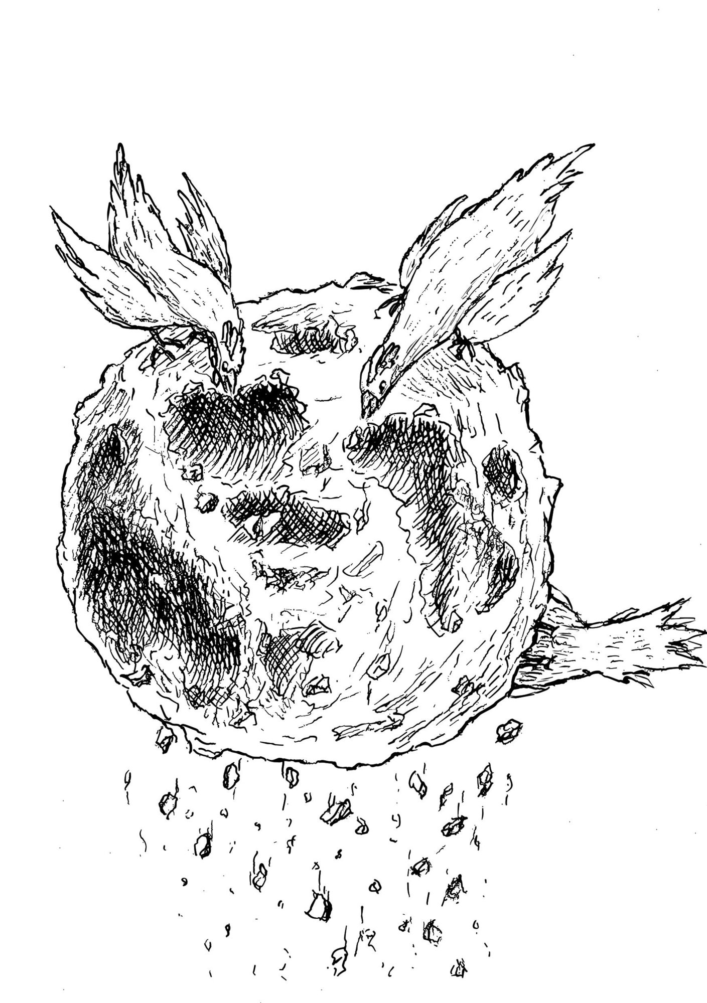 Voilà retard rattrapé. @Haeresis belle idée et belle composition @poltu jolie posture, j'aime beaucoup le rendu. @Guertty j'aime bien la façon dont tu as positionné le loup garou, soumis au pouvoir de la lune. Je devais combiner la lune avec le terme: picorer. Ce n'est pas une poule sur un mur qui picore du pain dur mais des poules géantes qui picorent la lune. Attention aux chutes de lune...3 points