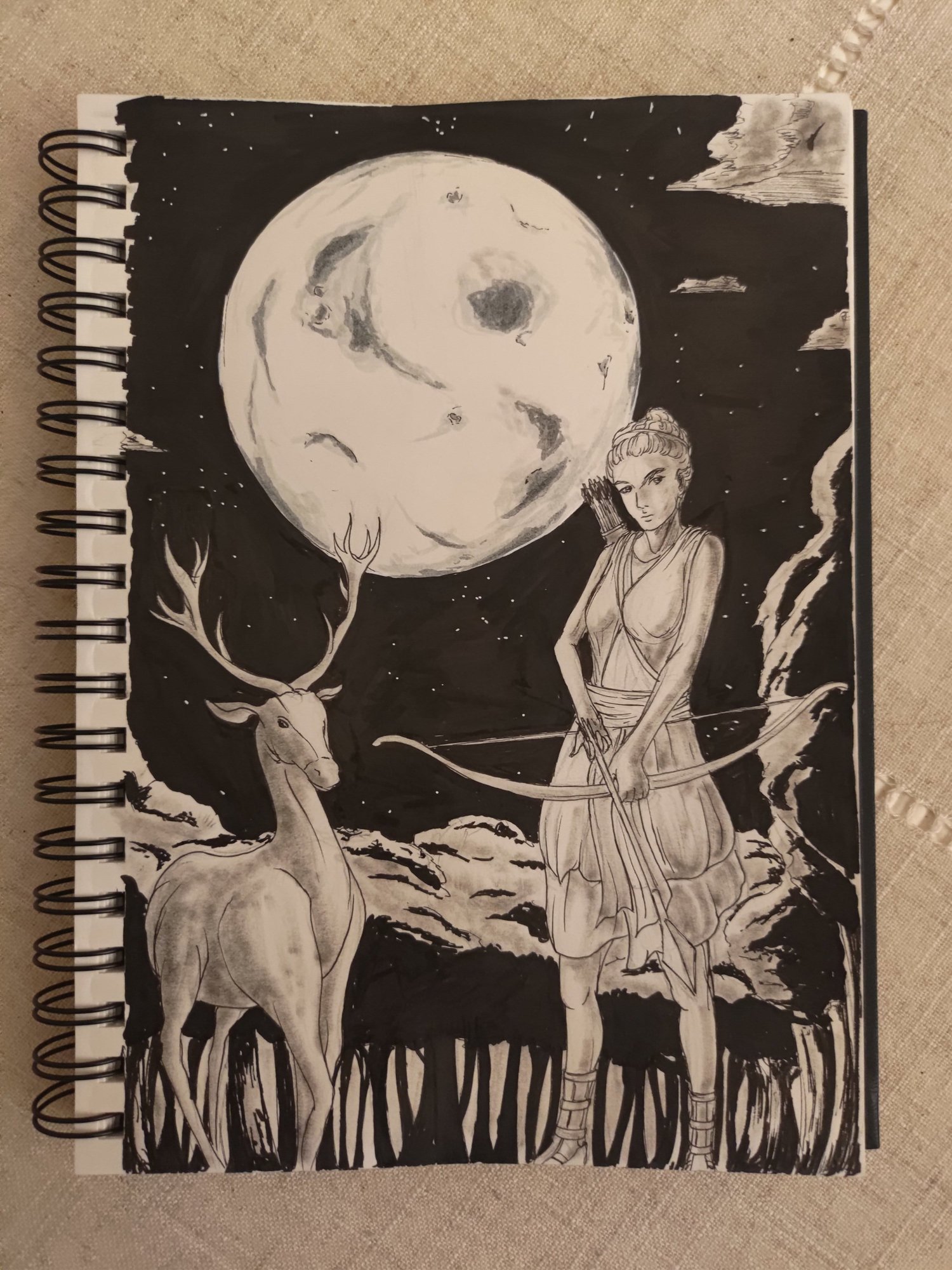 @stefou toujours de belles idées !! @SKARR encore une belle réalisation ! @Haeresis pour répondre à ta question, pas réf pour moi, juste mon crayon entre les pauses au travail... Pour ton image qui est très chouette, je trouve juste dommage que le sol soit la fin de ta feuille au niveau de la mise en page côté purement esthétique @Adra tu as testé avec le fond noir, pour faire ressortir la lune? @Guertty trop classe @alkecesa un léger aurait peut-être permis de mieux voir la lune2 points