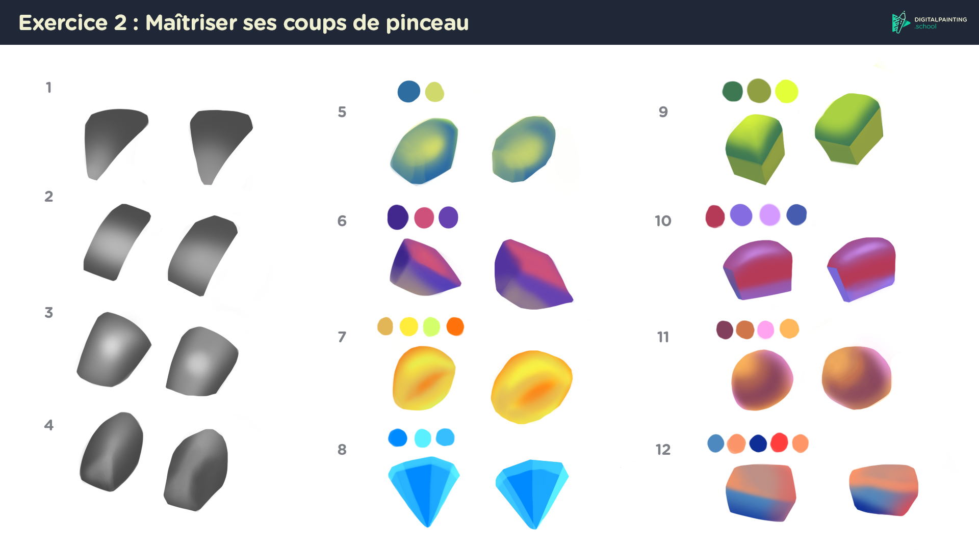 Hey ! Voici l'exercice n°2 du chapitre 1, j'y ai passé quelques heures c'étais pas simple pour moi au début, mais à force de faire des erreurs j'ai appris et la fin de l'exercice c'est fait plus facilement. Si je dois faire une auto-critique, je dirais : -Que mes formes ne sont pas similaires à celles de l'exercice, de plus les proportions ne sont pas exactes. -Certaines transitions de couleurs sont trop brutes, pas assez "smooth" si vous voyez ce que je veux dire Voilà pour mes pistes d'améliorations, si vous en avez à ajouter je suis bien entendu preneur !1 point