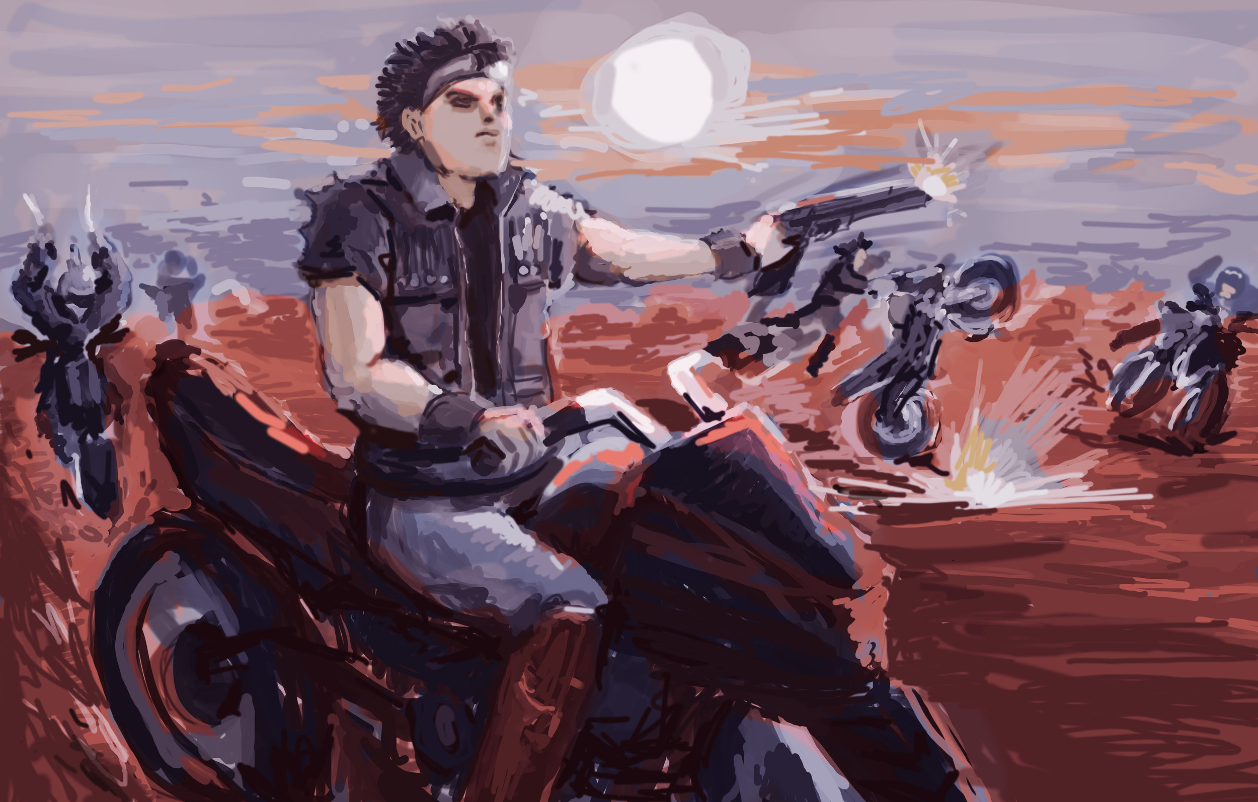 2 : Chazer Le second projet est centré sur Chazer. J’ai d’abord fait un premier jet vite fait pour donner une idée globale. Ensuite je me suis concentrée sur les pièces mécaniques. J’ai commencé par essayer de faire quelque chose qui puisse paraître mécaniquement vraisemblable, mais les résultats n’étaient pas sexy alors j’ai finalement opté pour quelque chose de plus récréatif pour l'œil du public. Après, je suis revenue sur les détails de ses vêtements. J’ai fait quelques recherches sur le style vestimentaire du mouvement punk. Bon, le souci, c’est qu’avec la mention “punk du désert”, je m’attends à ce qu’on soit nombreux à faire des choses qui se ressemblent pour ce personnage. Du coup, j’ai fait quelques essais pour réorienter un peu ma recherche pour le design du personnage. Je me suis dit qu’il serait intéressant que j’assume jusqu’au bout mes influences mangas des années 80, donc je me suis dit qu’ils serait intéressant que je fasse de ce personnage une sorte de seigneur de guerre du désert post-apo un peu à la manière de Raoh dans Hokuto No Ken. Je lui ai donc ajouté une épaulière, une cape et un casque. Je réfléchis aussi à passer la couleur de sa crète de rouge à blanc/argenté. Je pense que je ferai encore un ou 2 essais avant d’attaquer l’illustration finale. Et voilà pour la planche d’inspiration.1 point