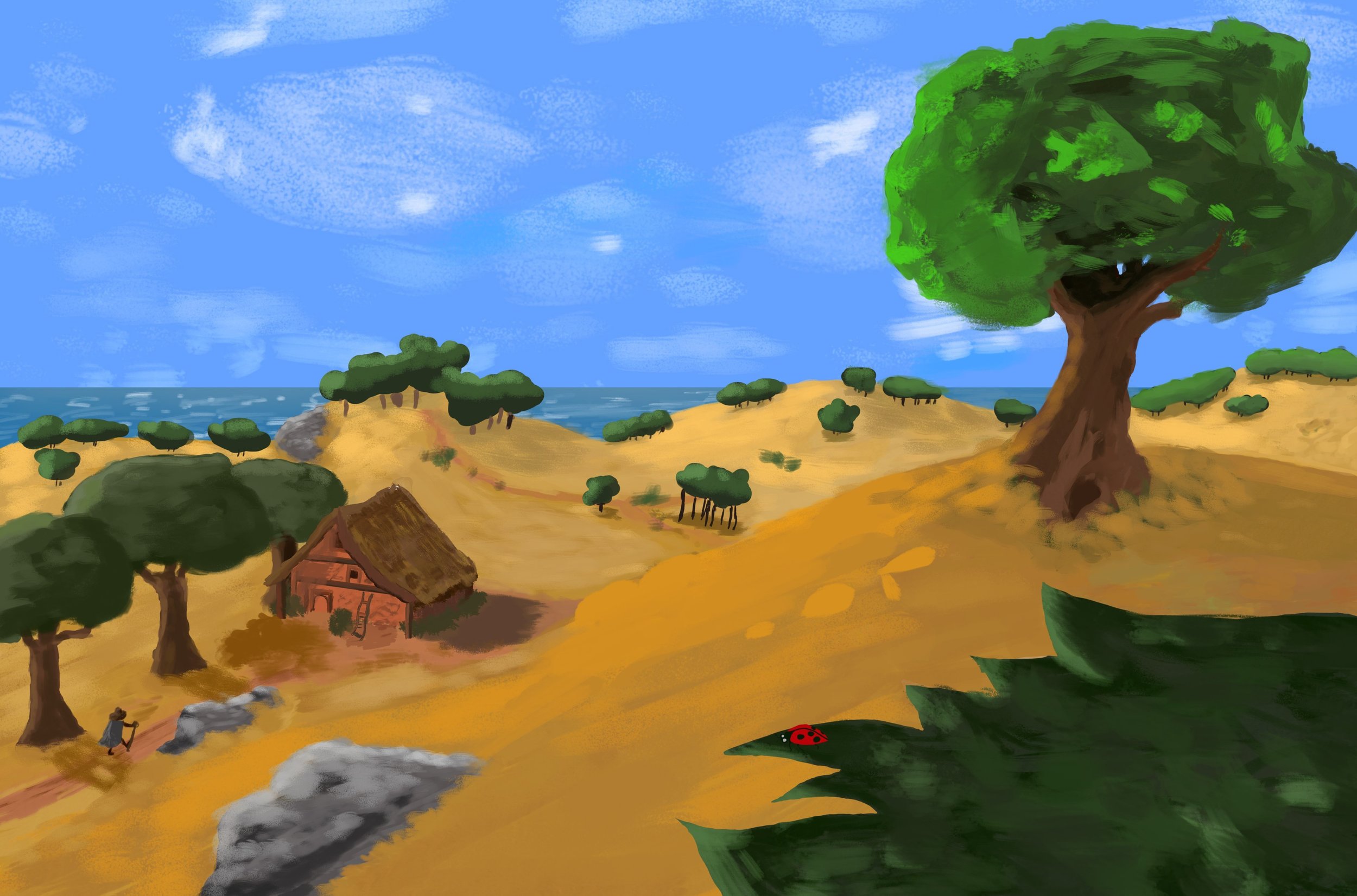 Pour un premier painting, c'est efficace ! J'aurais p-t placé la lune en entier sur le coin supérieur droit car on dirait qu'on a découpé l'image ^^ Mais j'aime bien cette ambiance. C'est reposant comme painting. Si je devais ajouter un point d'amélioration à ton painting, ça serait de marque les ombres par rapport à ta source de lumière qui est ta belle lune. Bon courage pour la suite 😉1 point