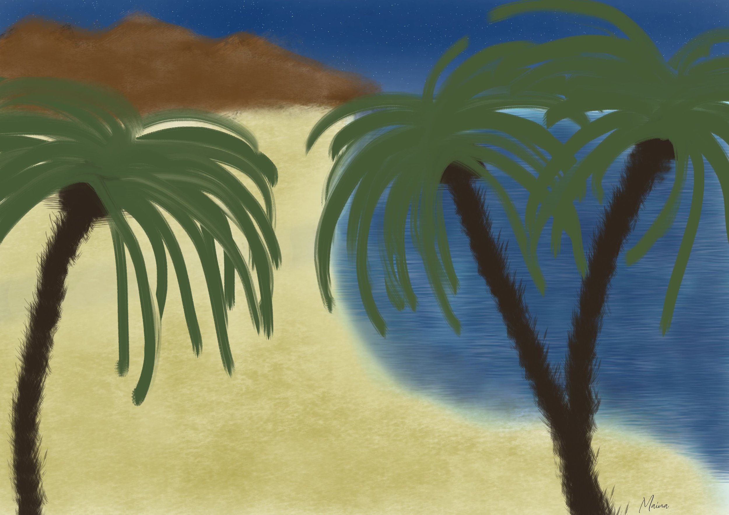 Bonsoir bonsoir ! Je me suis enfin lancée dans le programme indispensable, et voici donc mon exercice de fin. Je suis plutôt fière du ciel nocturne et de l'effet donnée à la mer... En revanche les palmiers et le reste c'est une horreur, je n'ai pas trouvé comment les rendre plus sympas. Je n'ai ni la technique ni les brushes visiblement, mais je n'ai pas de doutes quant au fait que je m'améliorerai avec les cours ! Je profite également de ce sujet pour poser les questions et problèmes que j'ai relevés en suivant le chap 0, j'espère que vous pourrez m'aider (ツ) À noter que je suis sur Krita et Mac, et que je suis super nulle en informatique, donc je pars pas dans les meilleures conditions x) 1) Dans la partie "Affichage" des réglages, je ne peux pas cocher autre chose que "OpenGL". Ça tombe bien c'est ce que Spartan nous conseille de paramétrer, mais est-ce que c'est normal ? Et si oui, à quoi est-ce que c'est lié ? 2) Concernant la limite de mémoire, dans sa vidéo Spartan dit qu'il ne faut pas en mettre beaucoup si on a un petit ordi.. Lui a 65 492 Mio, mais moi j'en ai que 8 192. À votre avis jusqu'à combien je peux aller pour pouvoir travailler correctement sans que ça risque de ramer ? 3) Et troisième question bonus : certains d'entre vous sont sur Krita/Mac ? Et si oui, vous arrivez quand même bien à suivre les cours ? Ça ne rame pas trop ? Bonne soirée à tous, et merci par avance pour les réponses que vous pourrez m'apporter !1 point