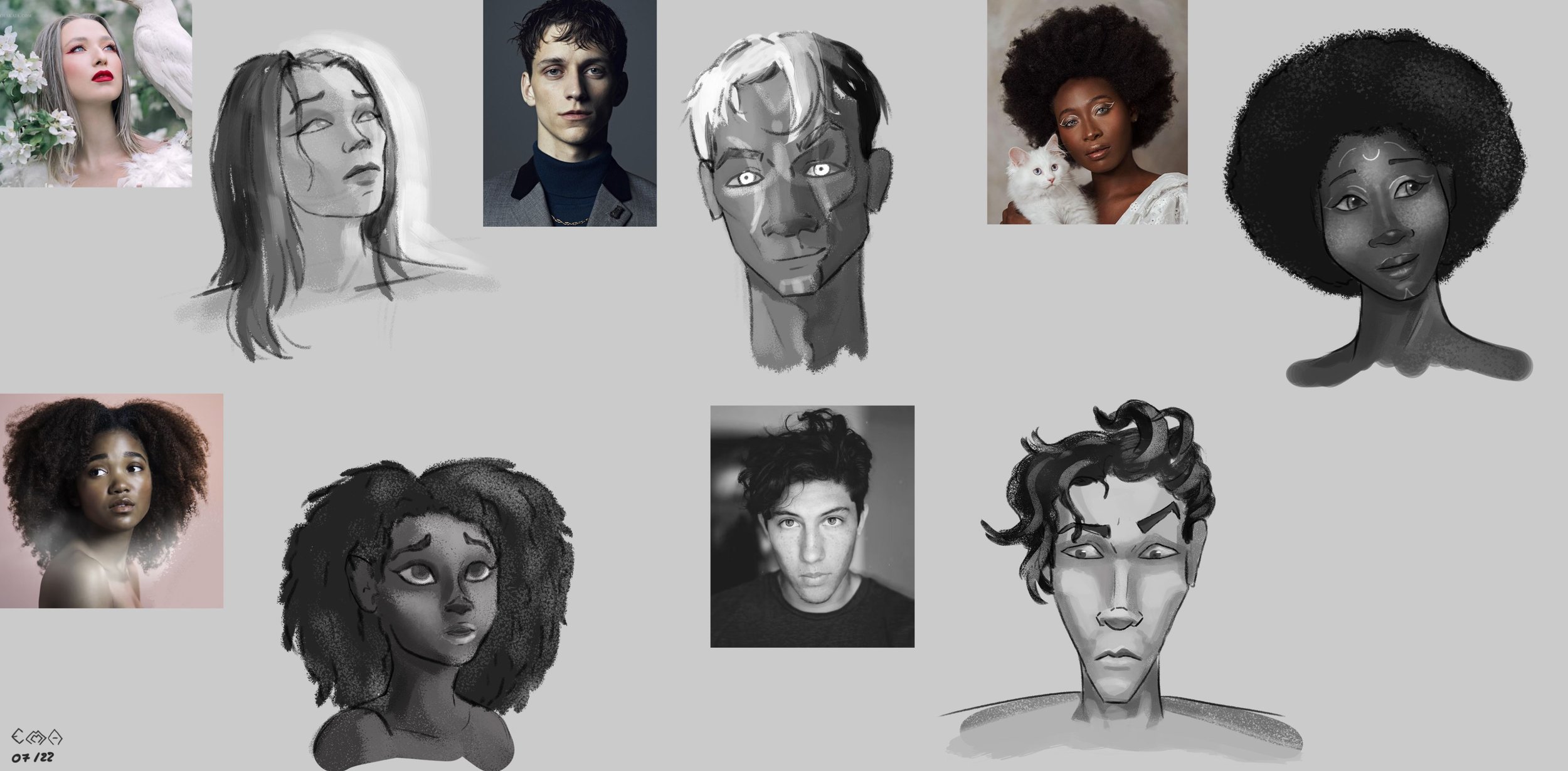 Hello les artistes ! Merci pour cet exercice, moi qui adore dessiner les visages, je suis ravie ! Voici mes croquis avec les refs 🙂 (par contre mon collage est bidon, mille excuses haha) J'ai tenté de varier les visages, autant sur la forme/âge que sur l'ethnie des personnes ! Voilà voilà ~ Hâte de voir vos travaux ! Bel été et restez au frais !1 point