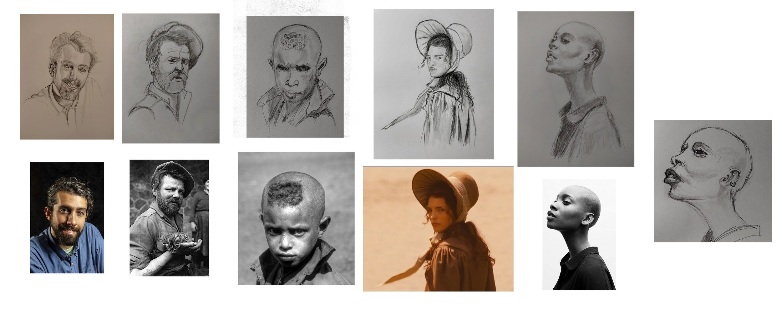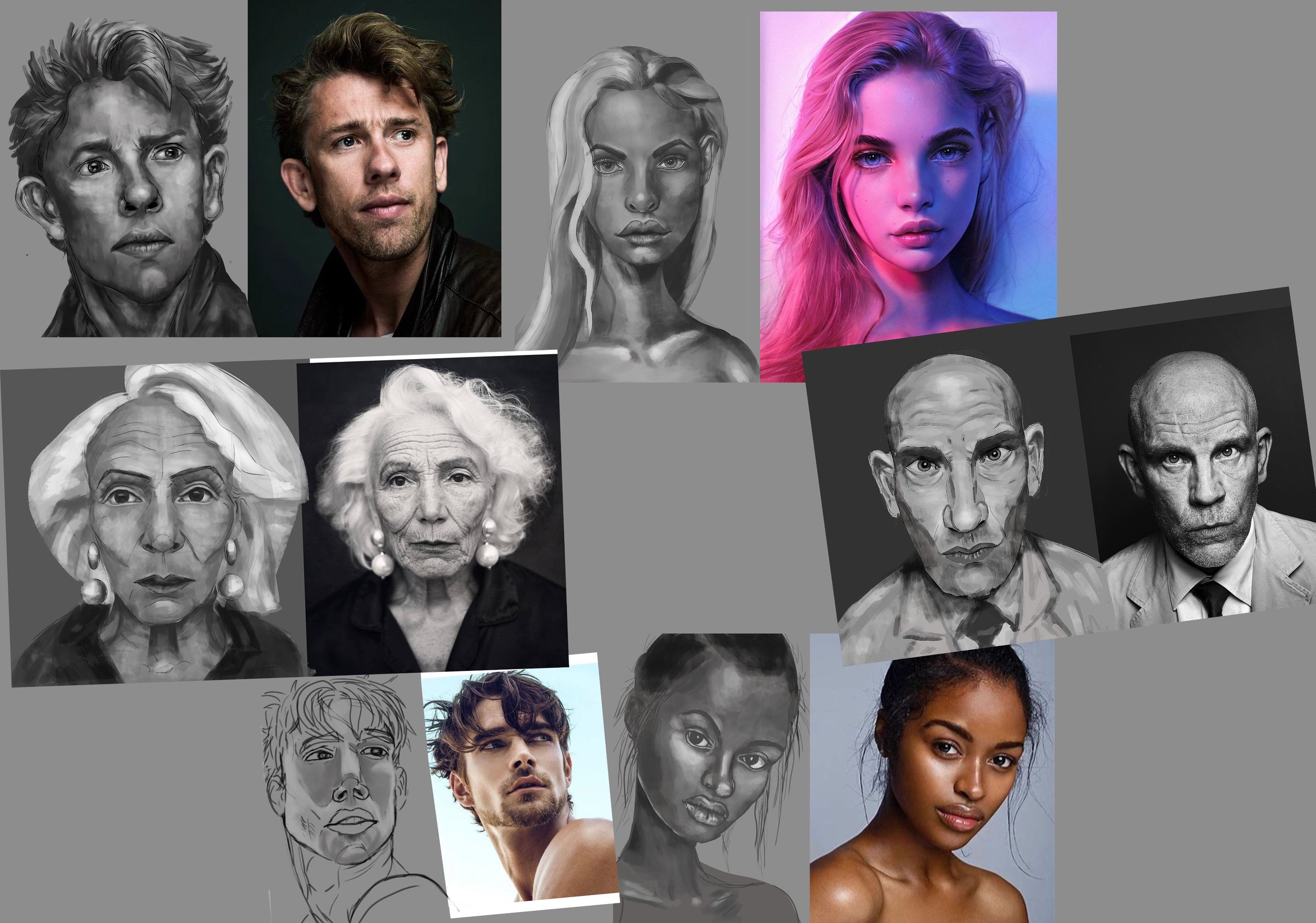 Hello tout le monde, quelle galère de faire des portraits!!! Systématiquement je me retrouve avec un ou plusieurs éléments du visage exagérés, voir caricaturés, Et alors si le modèle a un port de tête un petit peu de biais alors là, c'est la fin du monde!. J'ai encore énormément de boulot. Après, comme tous les exercices hebdo nécessitants de faire toute une série, je prend un petit peu plus d'aisance à chaque dessin et ça, ça fait plaisir! On reconnait les portraitistes dans l'âme! @Laurence Veron-Dor bravo pour ta restitution des expressions de tes visages! @SKARRtrès fun tes portraits @loukilouchebravo pour ta justesse, la ressemblance est sans équivoque. J'aimerais avoir ton niveau! @Wizziec'est vraiment excellent de réussir de manière aussi juste avec si peu de line, et aucun volume! @Adra @mako @droleb j'adore! vos perso sont prêts à sortir pour des anim' de Netflix! bravo à tous, @Charlotte R. @Hanoryne @GOoP @Midori @Lucie.dhz.san, @Chesis, @daff etc ....continuez, parce que le boulot paye toujours. Have fun et keep la pèche!1 point